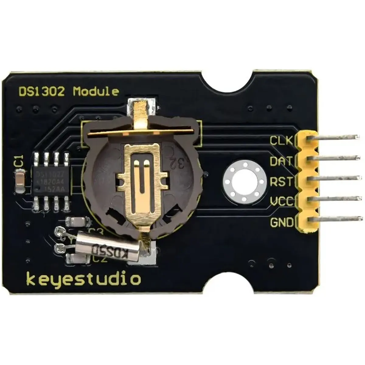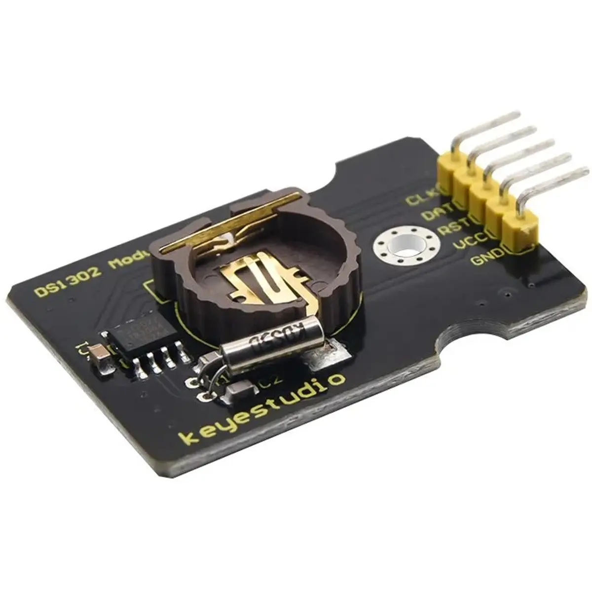 O módulo Keyestudio KS0517 é um relógio de tempo real baseado no chip DS1302, ideal para projetos que requerem contagem de tempo mesmo durante falhas de energia. Com um suporte para pilha CR1220 (não incluída), garante retenção de dados e tempo por mais de um ano. A comunicação é feita através de uma interface serial síncrona de apenas 3 pinos, sendo compatível com microcontroladores e ideal para sistemas com recursos limitados.