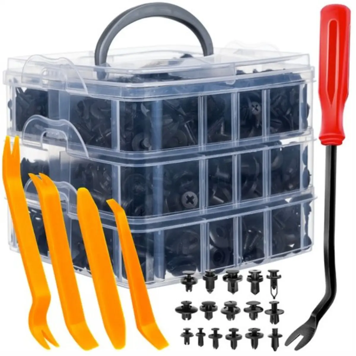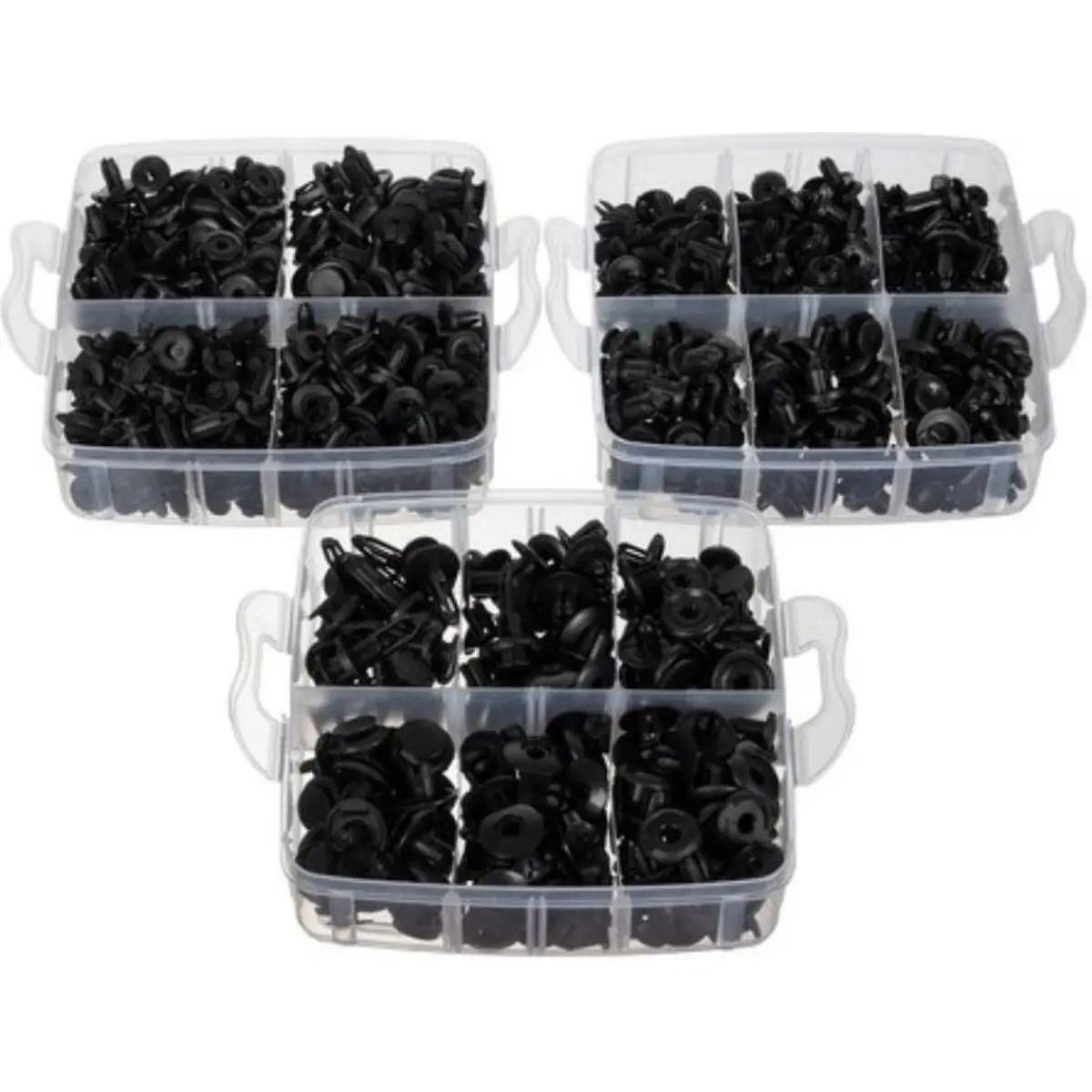 Conjunto de rebites para estofos automotivos com 16 tipos e 620 unidades, incluindo extratores, ferramenta para remover rebites e caixa organizadora. Destina-se a aplicações universais em estofos, para-choques, arcos das rodas, molduras, revestimentos de bancos, revestimentos e painéis das portas, soalhos, proteções de radiadores e motor, facilitando a substituição e reparação de fixações com componentes compatíveis que asseguram ajuste seguro e desempenho duradouro.