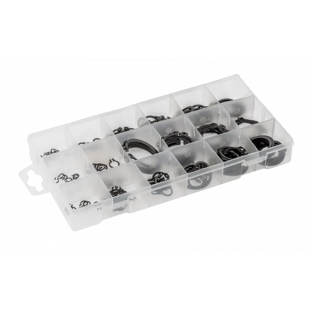 Anéis de retenção (Seeger E-CLIP). Utilizados para bloqueio e fixação contra deslizamento. Essenciais em oficinas automóveis e oficinas de reparação.