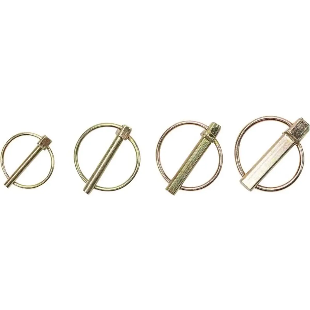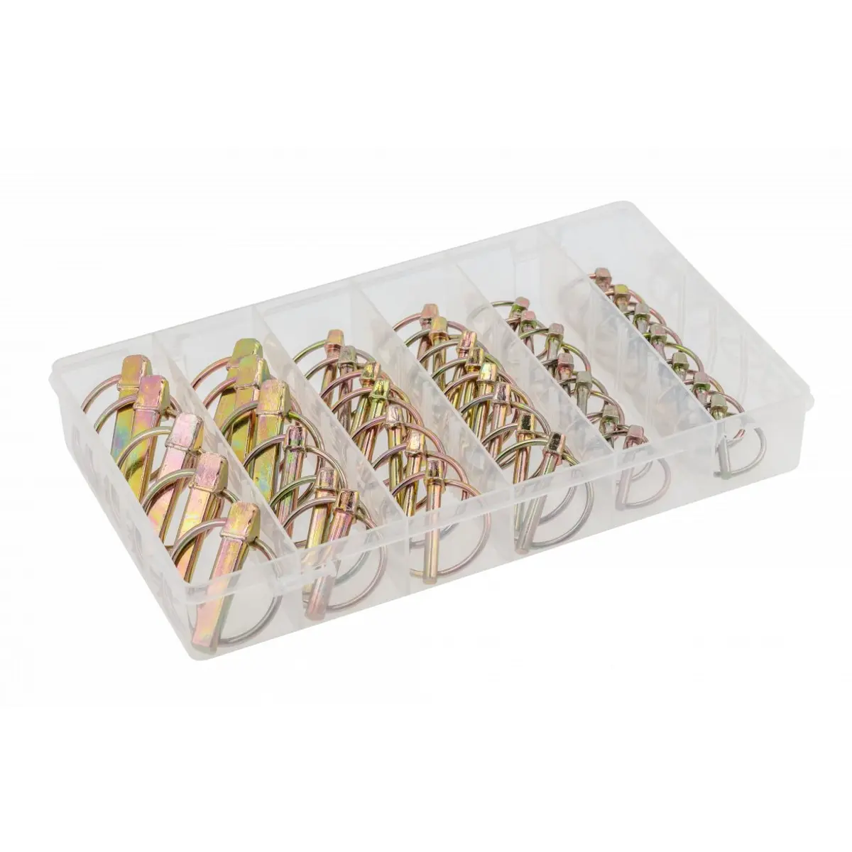 Cavilhas ou pinos de mola usados em aplicações diversas. O conjunto inclui 4 tamanhos diferentes, em aço galvanizado para maior resistência e embalados numa caixa compartimentada.