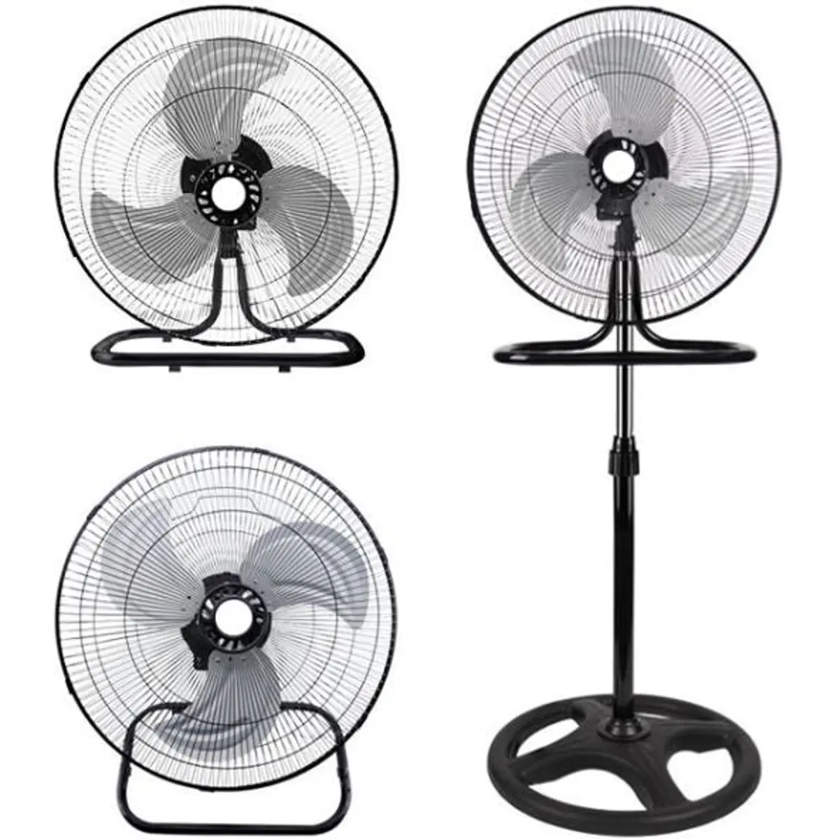 Ventoinha multifuncional com três modos de instalação (pé, mesa ou parede) para uso doméstico, escritórios, espaços comerciais ou industriais. Possui oscilação horizontal automática com paragem, cabeça ajustável para direcionar o fluxo de ar e três velocidades. O motor oferece elevada rotação (até 13000 RPM) para maior eficácia, com hélice de metal de 46 cm e estrutura em alumínio. A base é redonda (500 mm) e a altura é ajustável entre 55 e 130 cm; cabo de alimentação de 1,7 m. Silenciosa e eficiente.