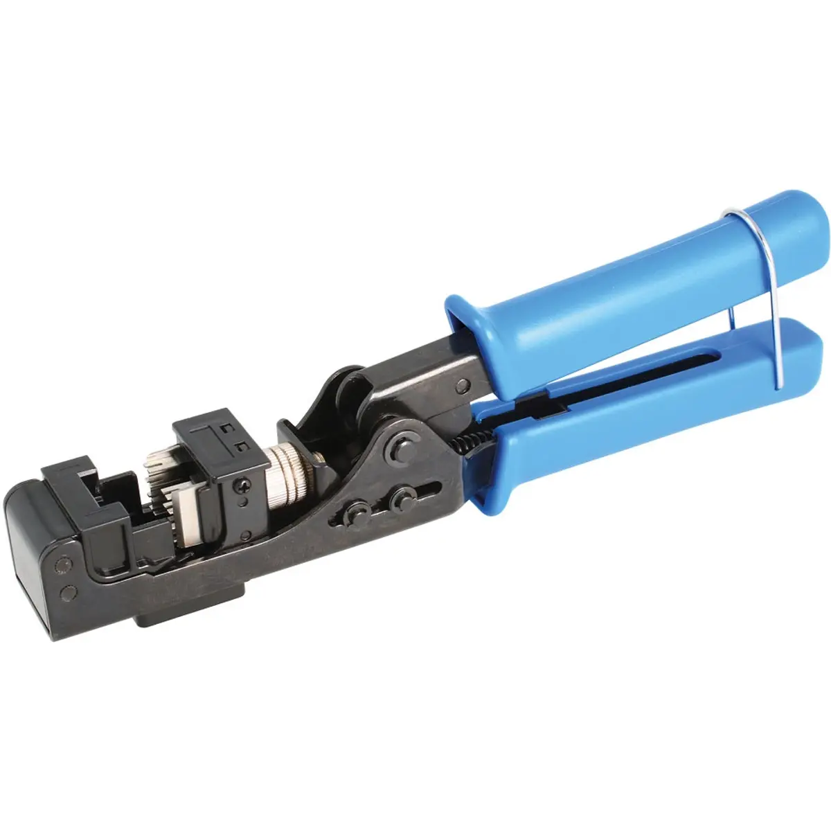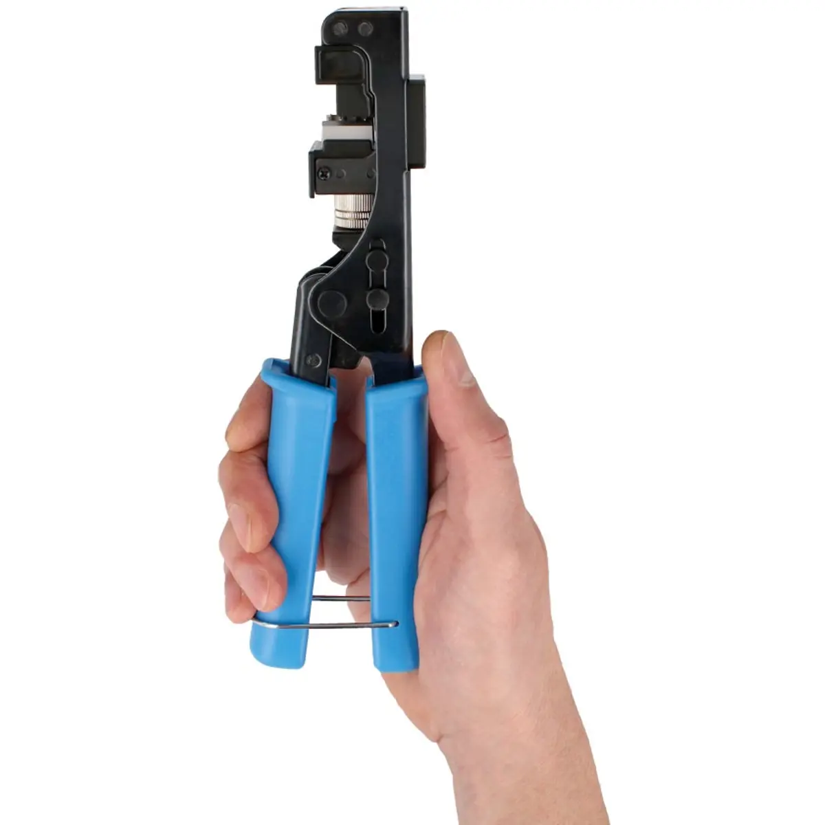 Ferramenta profissional adequada para cravar cabos de dados UTP em conectores RJ45 tipo Keystone de 90° com terminais IDC110. Permite a cravação simultânea dos oito fios e o corte do excedente de forma precisa, garantindo um acabamento limpo e eficiente. Ideal para instalações rápidas e seguras em redes estruturadas. Possui dispositivo de bloqueio para armazenamento fácil e seguro.