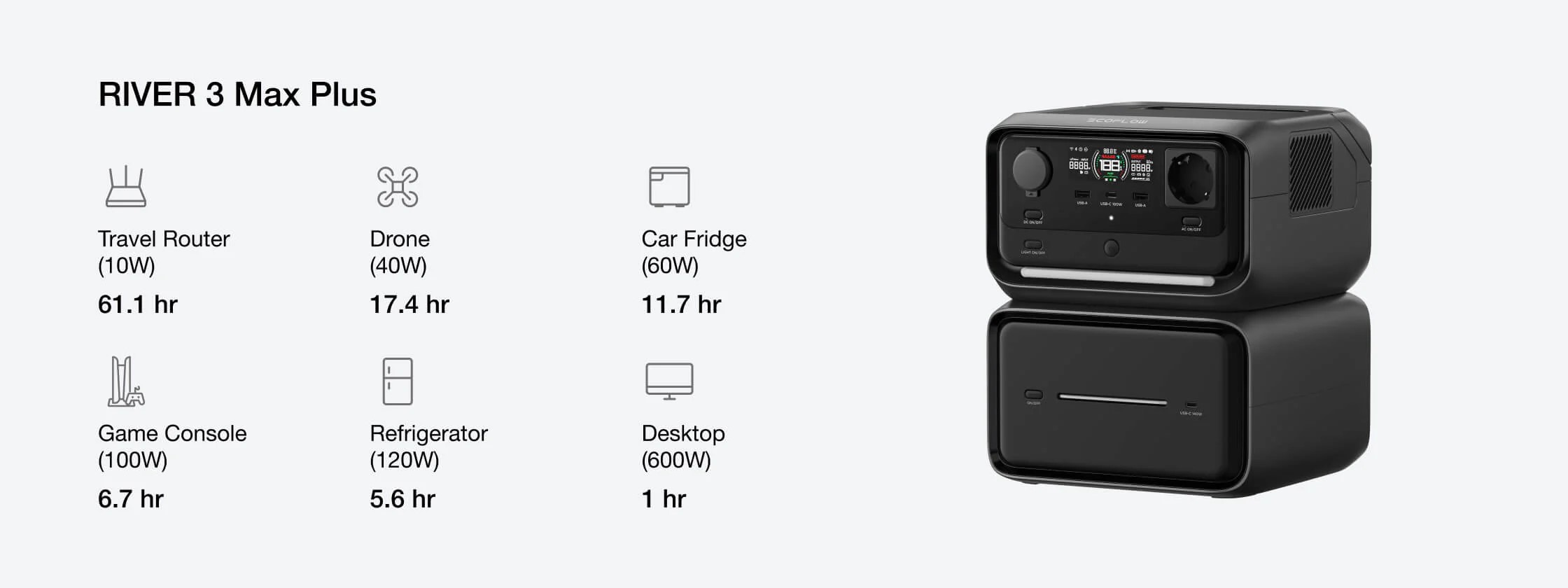 Com uma potência de saída contínua de 600 W, expansível até 1200 W com a função X-Boost, a River 3 Max Plus pode alimentar desde pequenos eletrodomésticos até equipamentos eletrónicos mais exigentes. A função UPS comutação <10 ms garante proteção contra falhas de energia, tornando-a também ideal para dispositivos sensíveis.