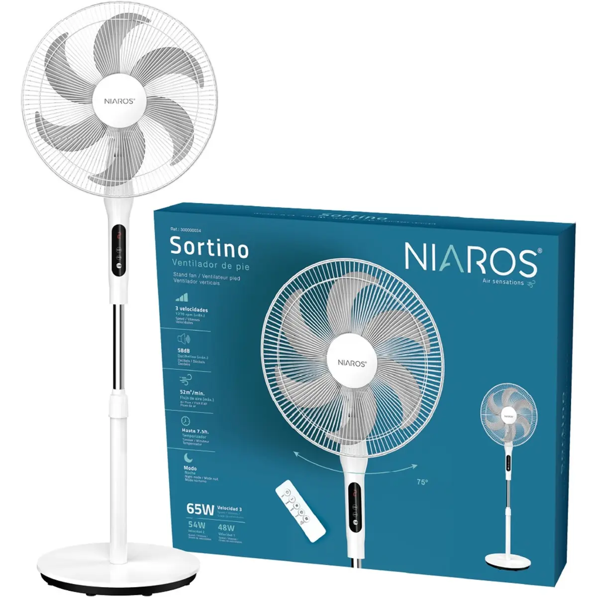 Niaros Sortino - Ventoinha de pé c/ controlo remoto e temporizador Ø43cm 65W branca