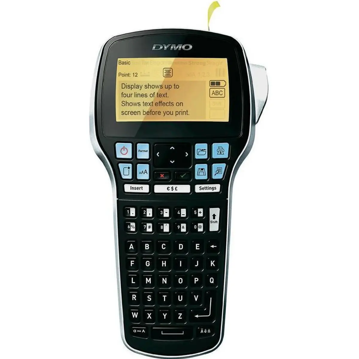 - Utilização recomendada com fitas DYMO D1 autênticas (larguras 6 mm, 9 mm, 12 mm, 19 mm), disponíveis em várias cores