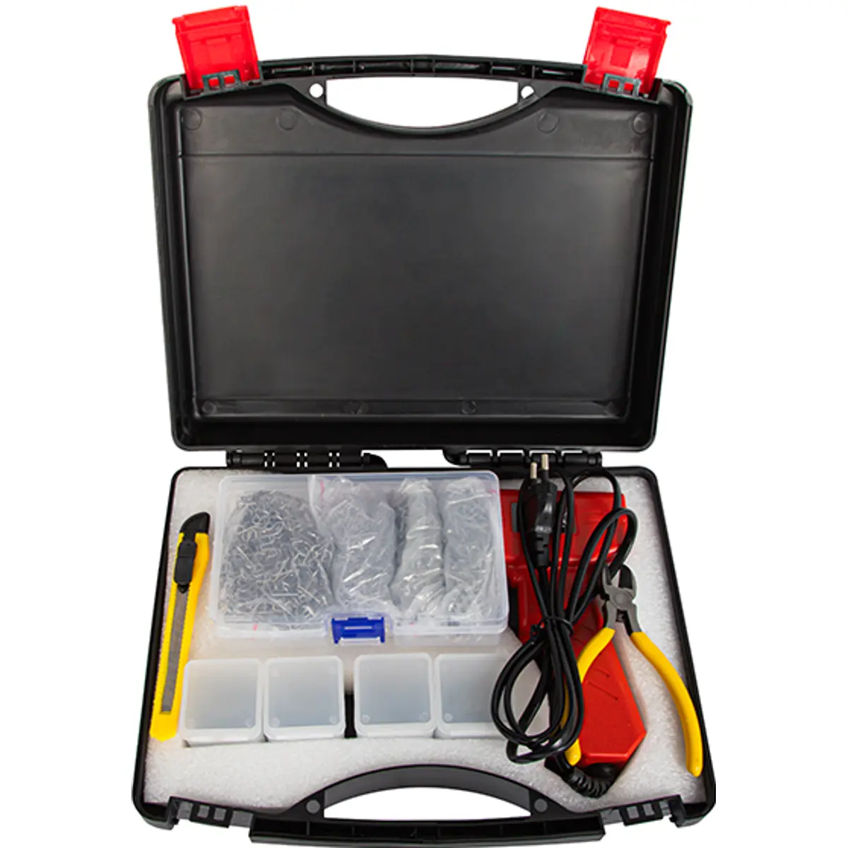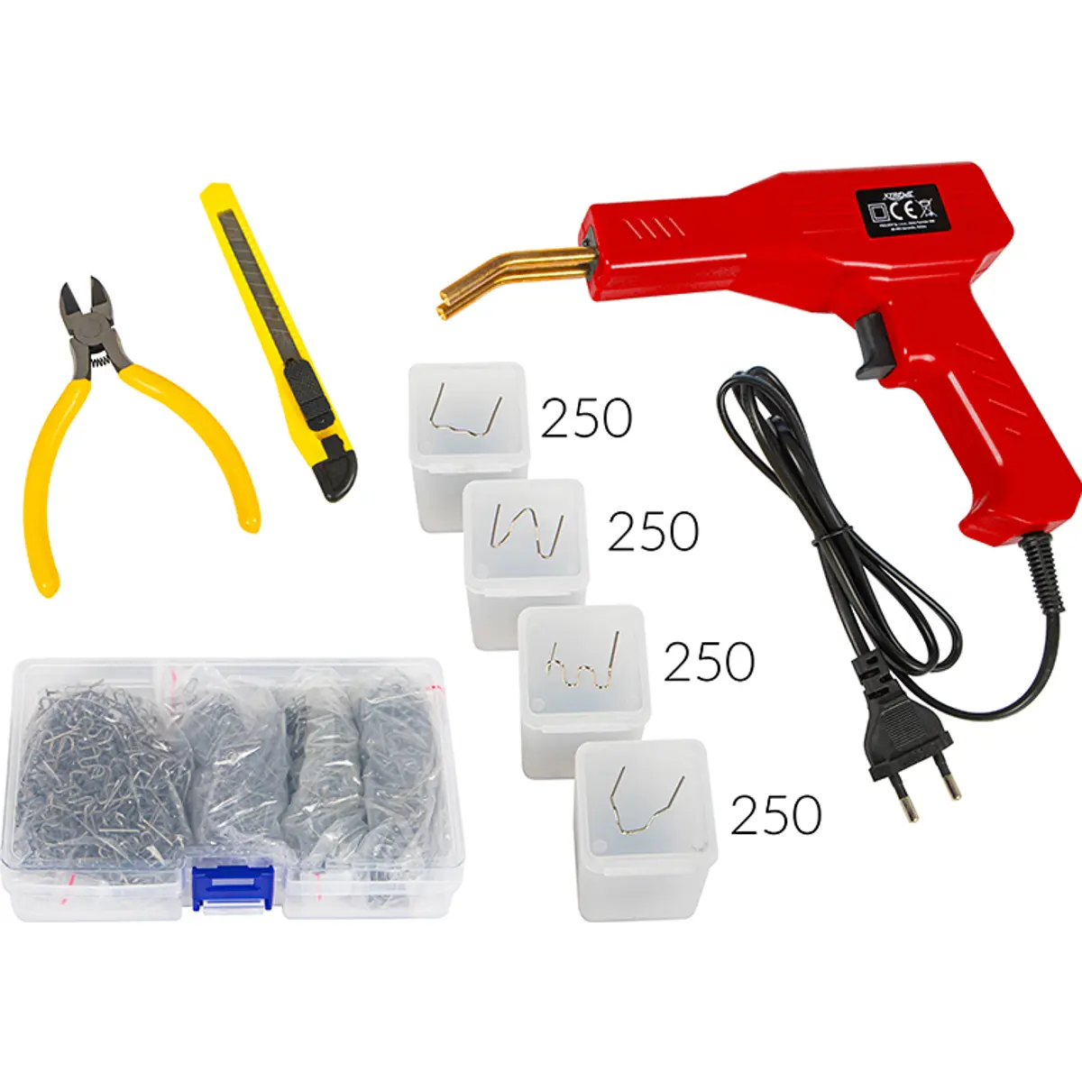 Pistola de reparação a quente, ideal para reparação de peças em plástico, soldadura de diversos tipos de polímeros e mascaramento de fissuras. Inclui 1000 grampos de aço (4 tipos de 250 unidades cada), bem como um conjunto de acessórios úteis: faca de lâmina segmentada, alicate para moldar o plástico e mala de transporte para organização e proteção. A construção em formato pistola facilita a utilização em locais de difícil acesso. Ferramenta robusta e indispensável em oficinas automóveis, trabalhos de manutenção, hobbies e aplicações industriais.