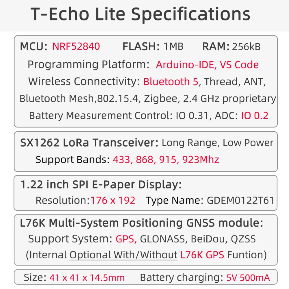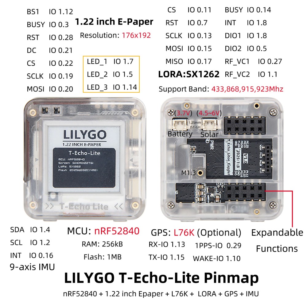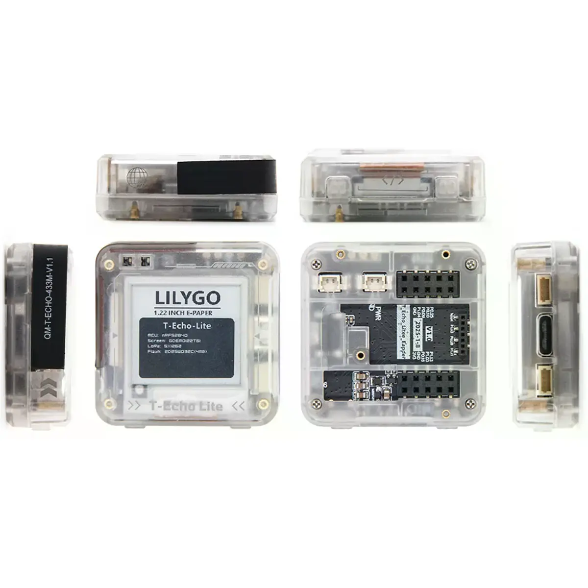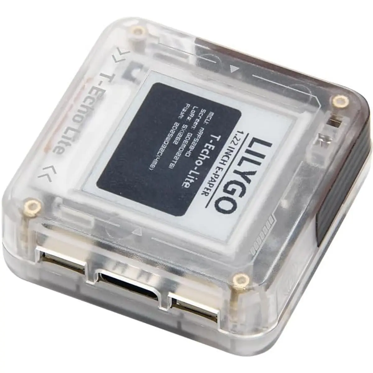 O T-Echo Lite é uma versão de baixo consumo do T-Echo, que integra nRF52840, transceptor LoRa SX1262 e ecrã e-paper SPI de 1,22". Esta versão 868MHz “With Shell” (com caixa) é compatível com firmware Meshtastic e suporta GPS L76K de forma opcional.