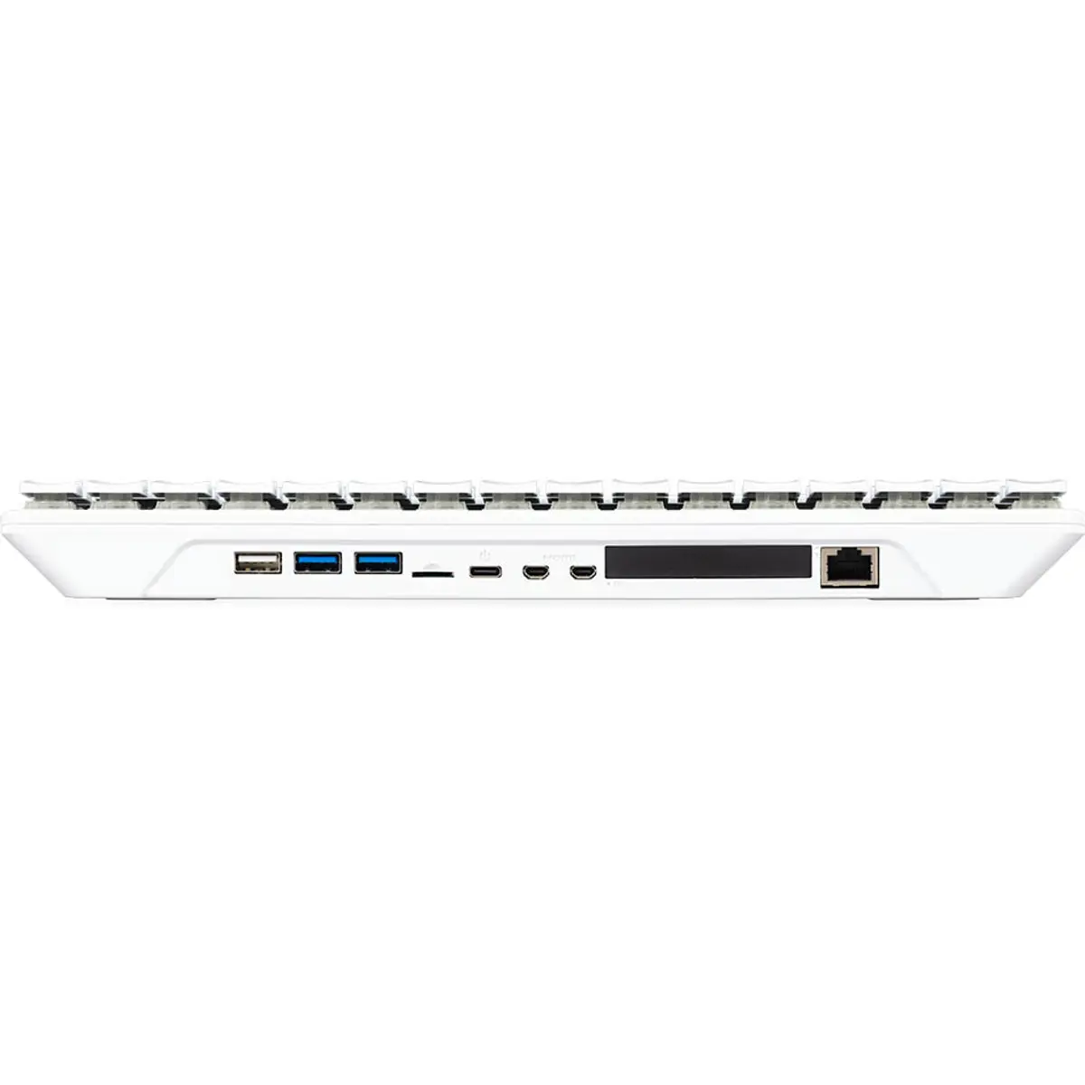 Para assegurar um desempenho consistente sob carga, integra ainda um dissipador de calor monobloco em alumínio, melhorando a gestão térmica. O teclado mecânico com switches Gateron KS-33 Blue e LEDs RGB endereçáveis completa o conjunto, oferecendo uma experiência de escrita precisa e altamente personalizável. Ferramentas incluídas permitem trocar keycaps e substituir o SSD com facilidade, para quem pretende personalizar ou expandir o sistema.