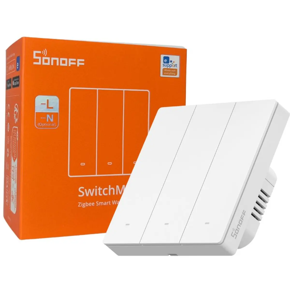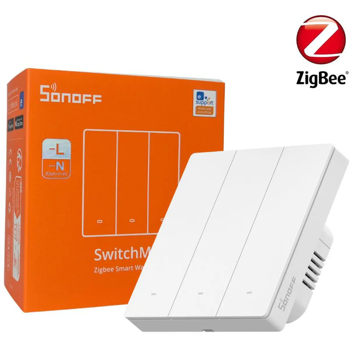 interruptor triplo Zigbee 3.0 de encaixar compatível com a aplicação eWeLink e plataformas abertas como Home Assistant (ZHA ou Zigbee2MQTT). Permite controlo remoto, temporizadores e cenários, com modo sem neutro (end device, carga mínima 3 W, sem suporte para lâmpadas inteligentes) ou modo com neutro (router Zigbee com Relay Detach). Compatível com Alexa e Google Home, e com gateways compatíveis; LED azul por botão para visibilidade.