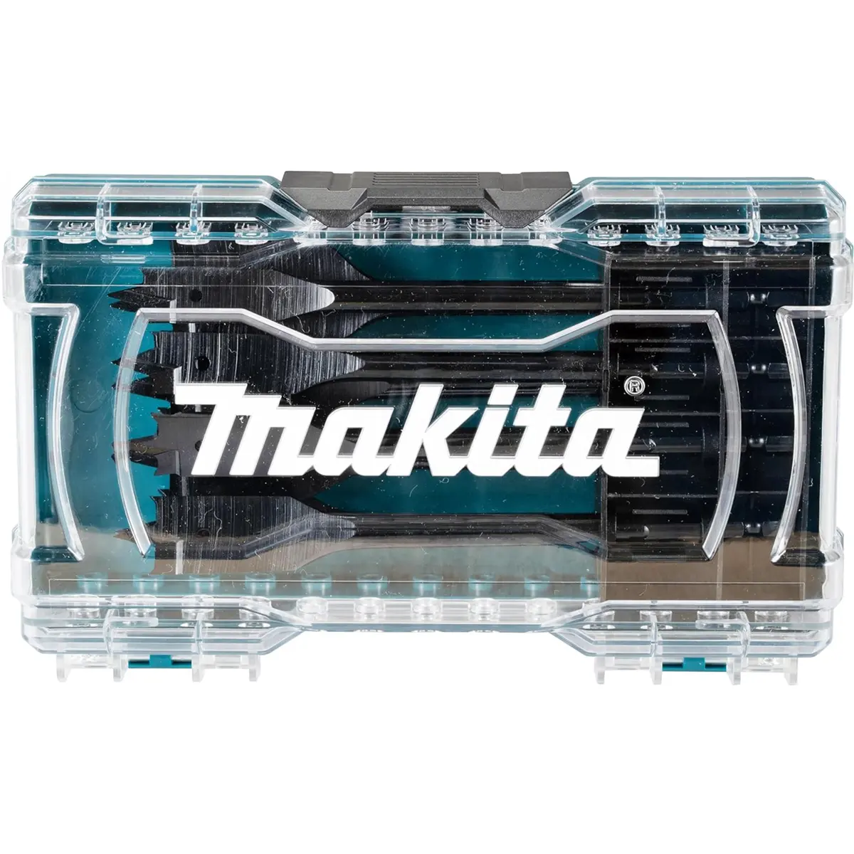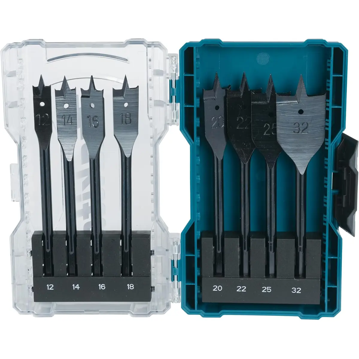 Conjunto de 8 brocas planas para madeira Makita E-08698, concebido para perfurar a maioria dos tipos de madeira, tanto macia como dura. As brocas vêm num estojo compacto e resistente de plástico, que protege o conteúdo e facilita o transporte e armazenamento.