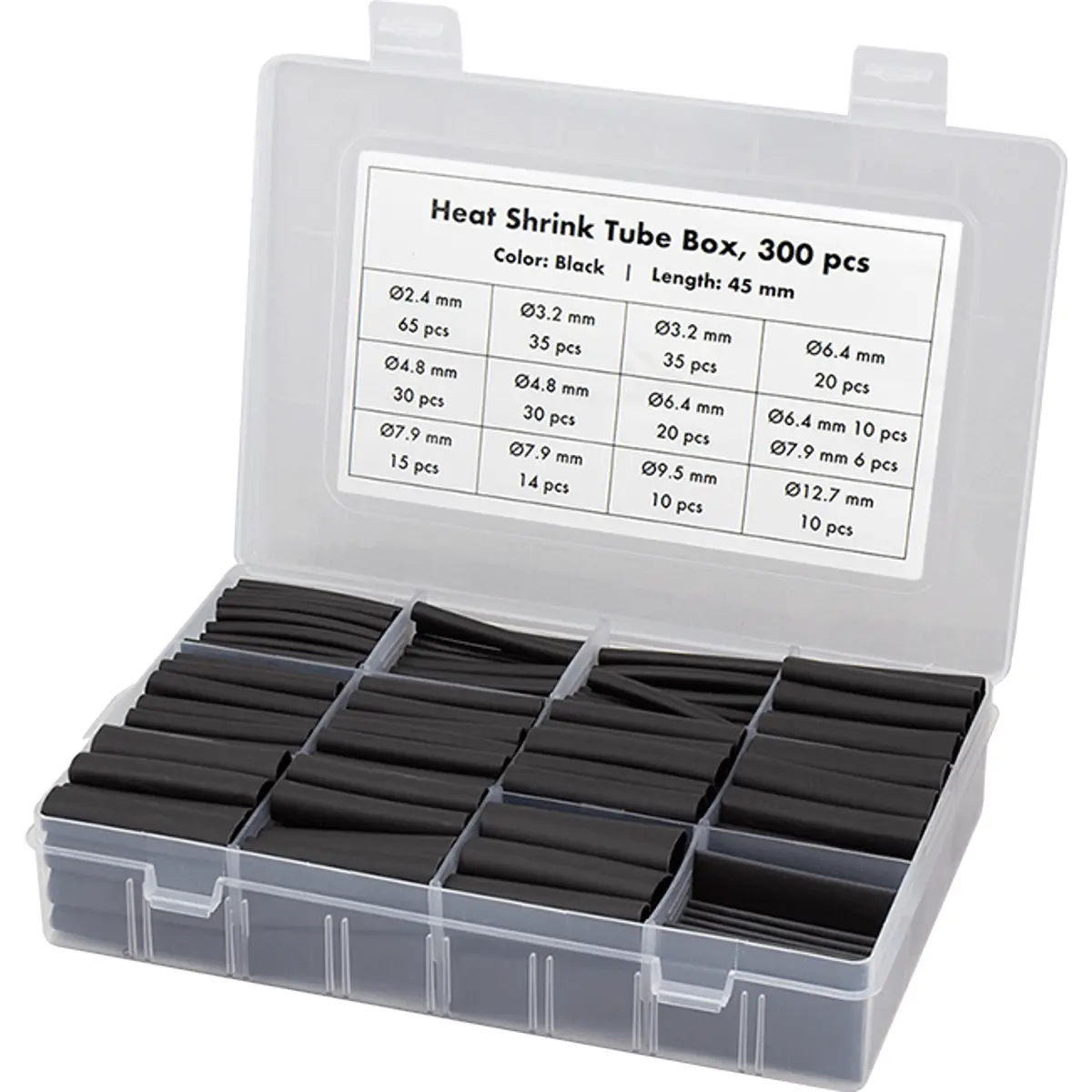 O conjunto de tubos termorretráteis com adesivo interno oferece estanqueidade e isolamento elétrico para reparações de cabos, circuitos e ligações. Inclui 300 tubos com sete diâmetros (2,4-12,7 mm) e comprimento fixo de 45 mm, com rácio de retração de 3:1. Encolhem cerca de 5% no comprimento, mantendo flexibilidade após retração. São resistentes a abrasão, corrosão e pressão, feitos de PE, com caixa plástica de armazenamento com tampa articulável até 180°, ideal para aplicações domésticas e industriais.