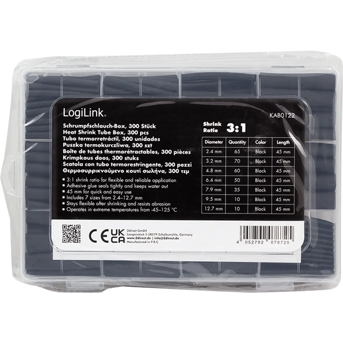 O conjunto LogiLink inclui 300 peças de tubo termorretráctil, acondicionadas numa caixa plástica resistente. Fabricados em material PE de alta qualidade, estes tubos são à prova de água, resistentes à pressão, ao desgaste e à corrosão, proporcionando excelente isolamento elétrico e durabilidade. São adequados para reparação de cabos, circuitos e fios, bem como para proteção mecânica e fixação de ligações em projetos domésticos e industriais. Uma solução segura, fiável e ecológica, livre de substâncias tóxicas.