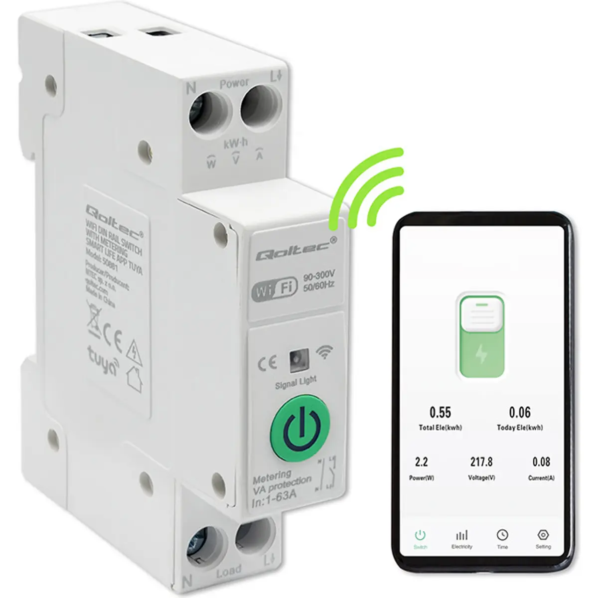 Este relé Wi-Fi da Qoltec é uma solução inteligente para monitorizar e controlar o consumo energético de forma remota e precisa. Compatível com as aplicações TUYA e Smart Life, permite gerir dispositivos elétricos e acompanhar o consumo em tempo real, diretamente a partir do smartphone. Concebido para montagem em calha DIN TH35, é ajustável entre 1A e 63A, tornando-se ideal tanto para pequenos aparelhos domésticos como para equipamentos de maior potência.