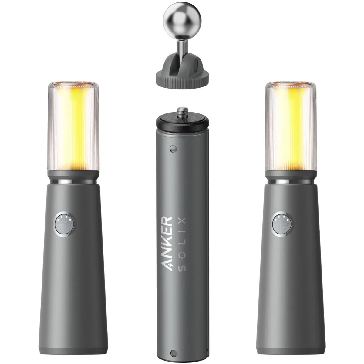Inclui duas luzes de acampamento recarregáveis (AK-01) e um tubo telescópico até 1 m, ideais para ambientes de trabalho, estúdios móveis ou uso exterior. Oferece modos de lanterna, luz ambiente e SOS, com 2600 mAh por unidade.