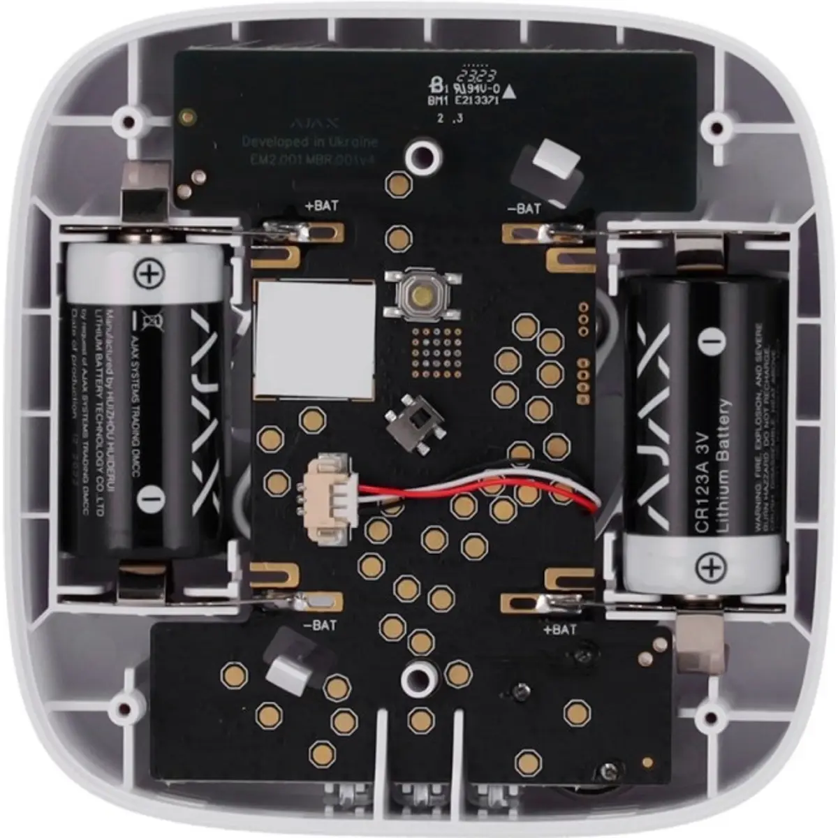 Funciona até 7 anos com duas baterias CR123A substituíveis. O sistema avisa o utilizador com 30 dias de antecedência antes do esgotamento das baterias, via app Ajax e sinal sonoro/visual no detetor.