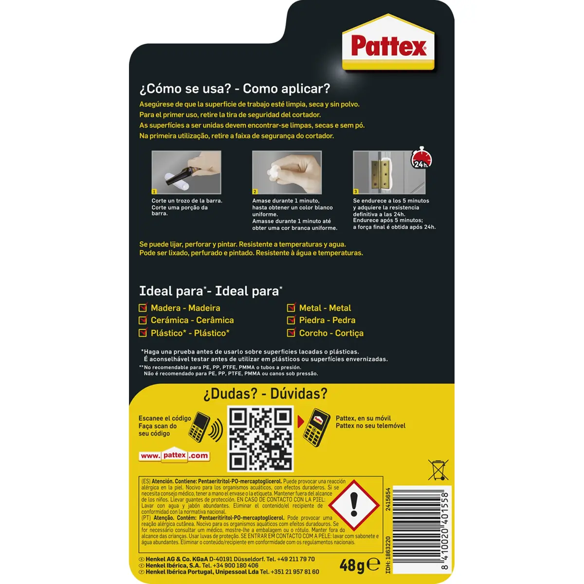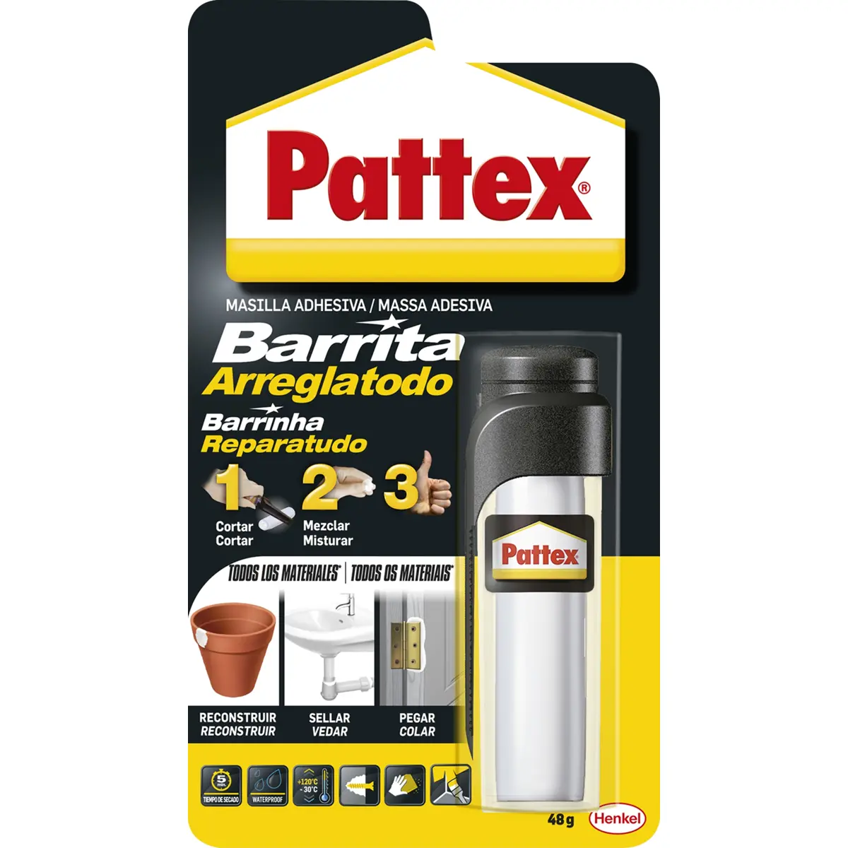 Massa Epóxi Reactiva Pattex é um adesivo de alta resistência, sem solventes, fácil de amassar e aplicar. Cola, preenche e veda, sendo ideal para fixar, reconstruir e arranjar uma ampla variedade de materiais: madeira, metal, cerâmica, plásticos (exceto PE, PP e Teflon), vidro, tijoleira, gesso e cortiça. Exemplos de aplicação incluem colagem de acessórios de casa de banho e cozinha (toalheiros, espelhos, cabides, armários, suportes de especiarias, batedeiras, ganchos), preenchimento de buracos, reconstrução de dobradiças partidas, fixação de puxadores e batentes de portas, reparação de degraus, cadeiras e outros móveis, bem como vedação de pequenas fugas de água em tubagens e sistemas de aquecimento.