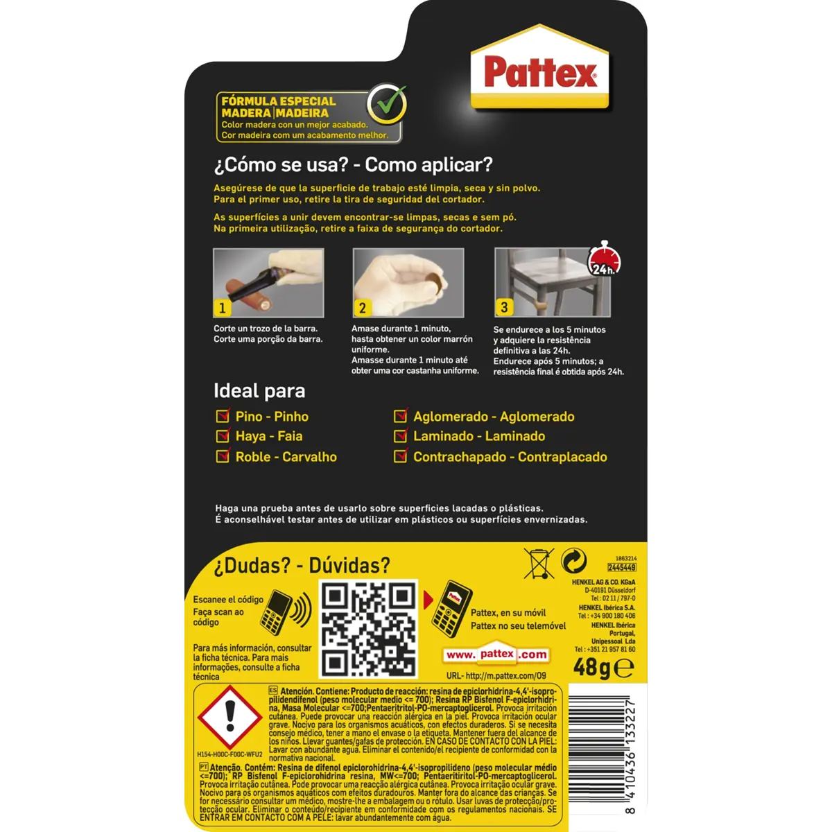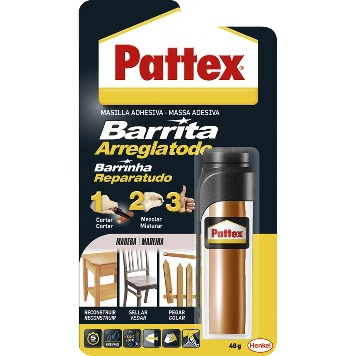 Pattex Barra Cola-Tudo Especial Madeira é um mástique adesivo epóxi extra forte, desenvolvido para reparar, reconstruir e restaurar objetos e peças de madeira. Ideal para substituir partes danificadas ou em falta, pode ser moldada como plasticina e, após endurecimento, adquire a consistência e dureza do metal. Proporciona colagem, preenchimento e reconstrução permanente, sendo adequada para utilização em camadas espessas. Após endurecer, a massa pode ser lixada, polida, envernizada e pintada. Adere a todos os tipos de madeira (pinho, faia, carvalho, nogueira, mogno), aglomerado, chapa e MDF, e também permite colar madeira a outros materiais.