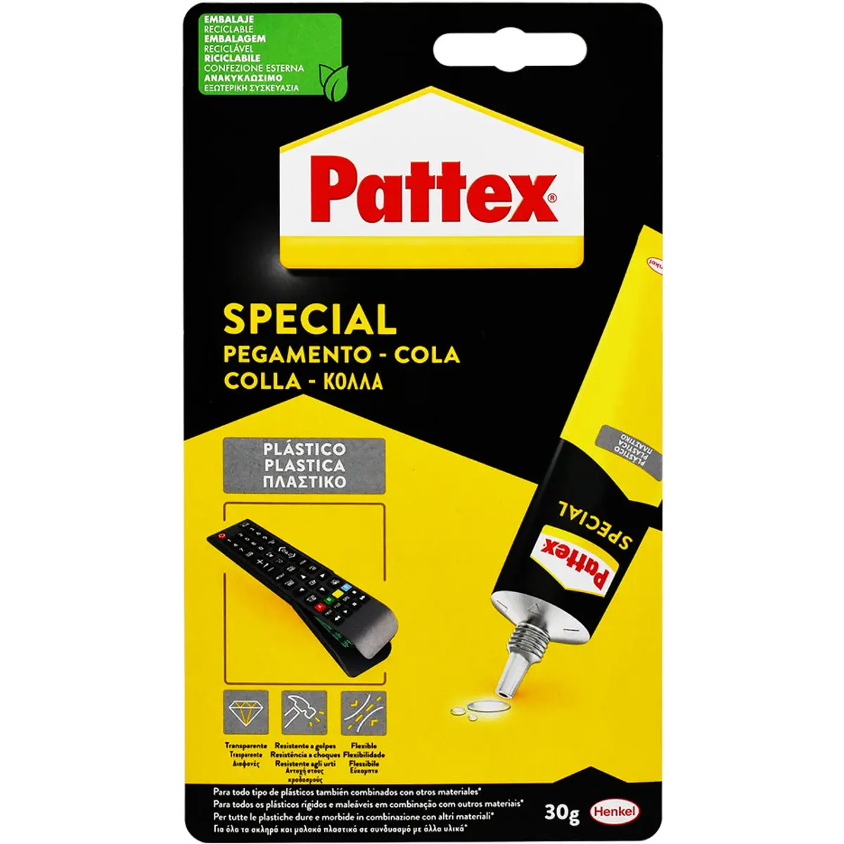 O Pattex Especial PLÁSTICO é uma cola de contacto especialmente formulada para plásticos, adequada também para pequenas peças de cartão, pele, PVC rígido, PVC flexível, vidro, pedra, madeira, metal e combinações destes materiais. Não é indicada para PE, PP, Teflón® ou Porexpan®.