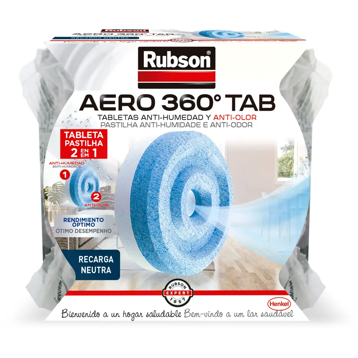 As pastilhas bicolores RUBSON AERO 360° foram desenvolvidas com tecnologia 2 em 1 para um controlo superior da humidade e neutralização de odores.