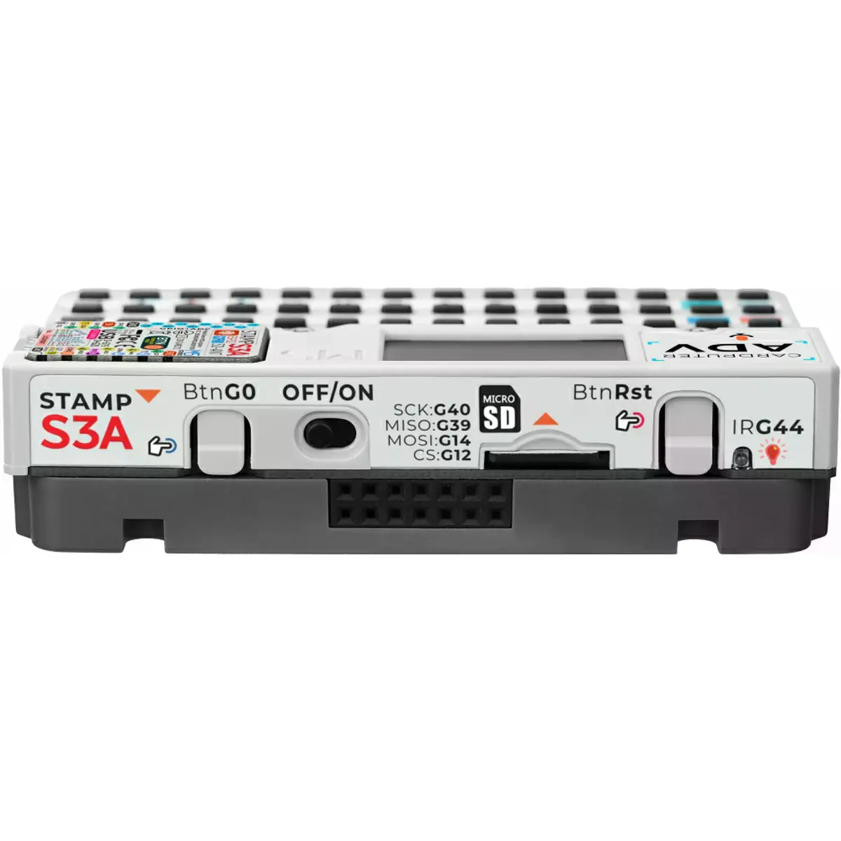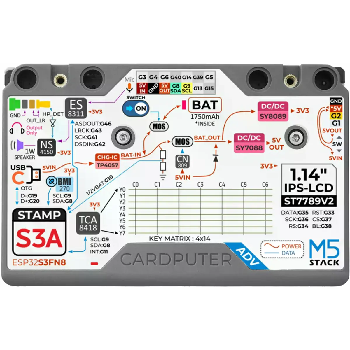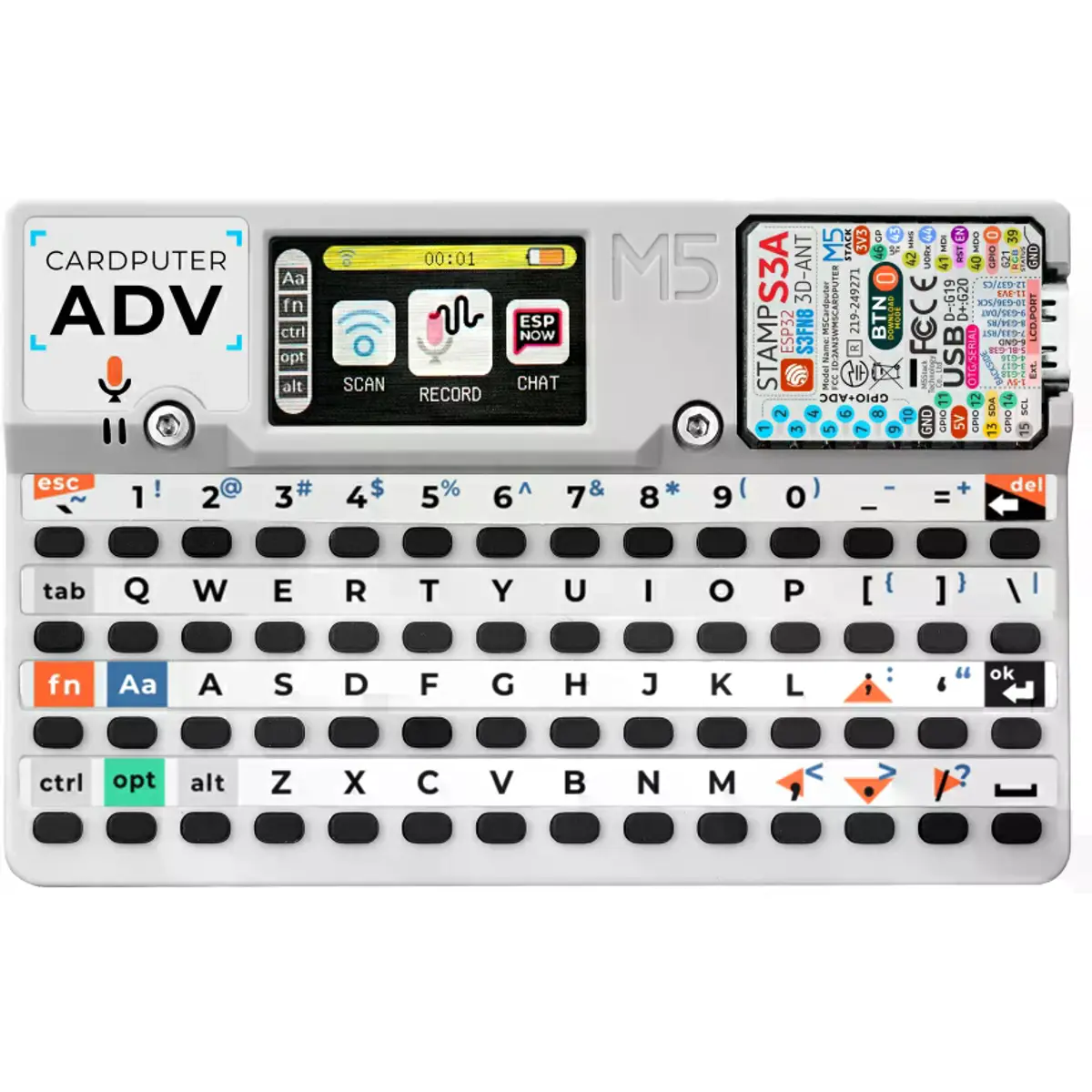 O M5Stack Cardputer Adv é uma plataforma programável compacta, em formato de cartão, concebida para prototipagem rápida, desenvolvimento de sistemas embebidos e aplicações IoT. Baseado no módulo Stamp-S3A com ESP32-S3, combina um ecrã LCD de 1,14" com um teclado físico de 56 teclas, oferecendo uma interface prática para interação direta, testes e controlo em tempo real.