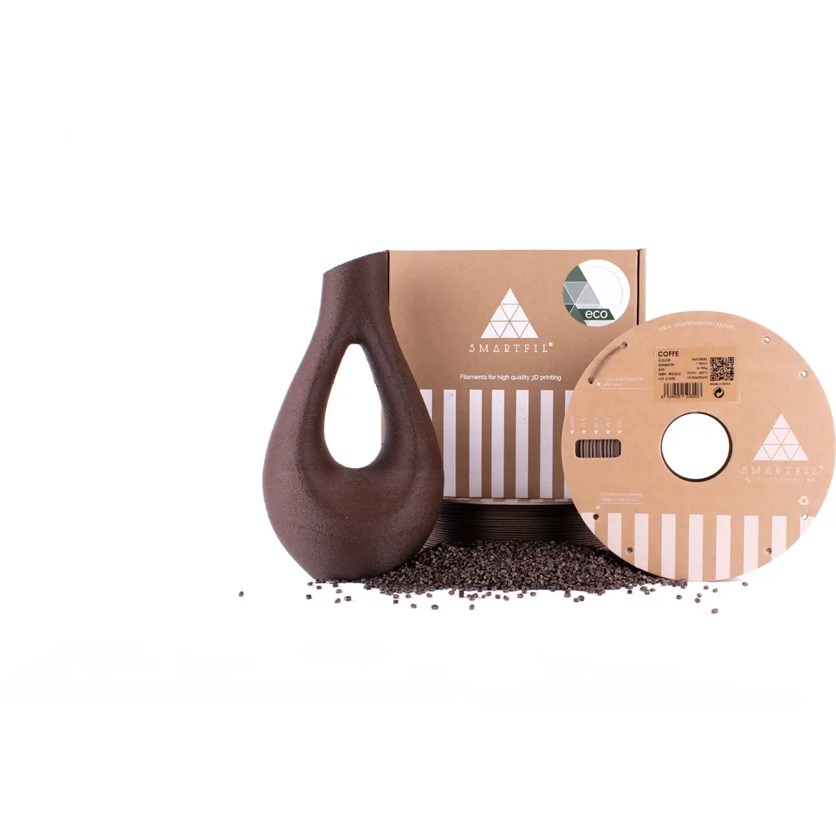 O SMARTFIL® ECO COFFEE é um filamento ecológico e inovador que combina impressão 3D com sustentabilidade e paixão pelo café. Fabricado com 20% de resíduos de café reciclado e 80% de PLA biobasado, oferece uma alternativa responsável e original para criadores que desejam reduzir a pegada ambiental sem comprometer a qualidade. Possui acabamento mate e textura ligeiramente granulada, proporcionando um toque singular e um aroma agradável a café torrado durante a impressão. Ideal para projetos de design, decoração e produtos com identidade ecológica.