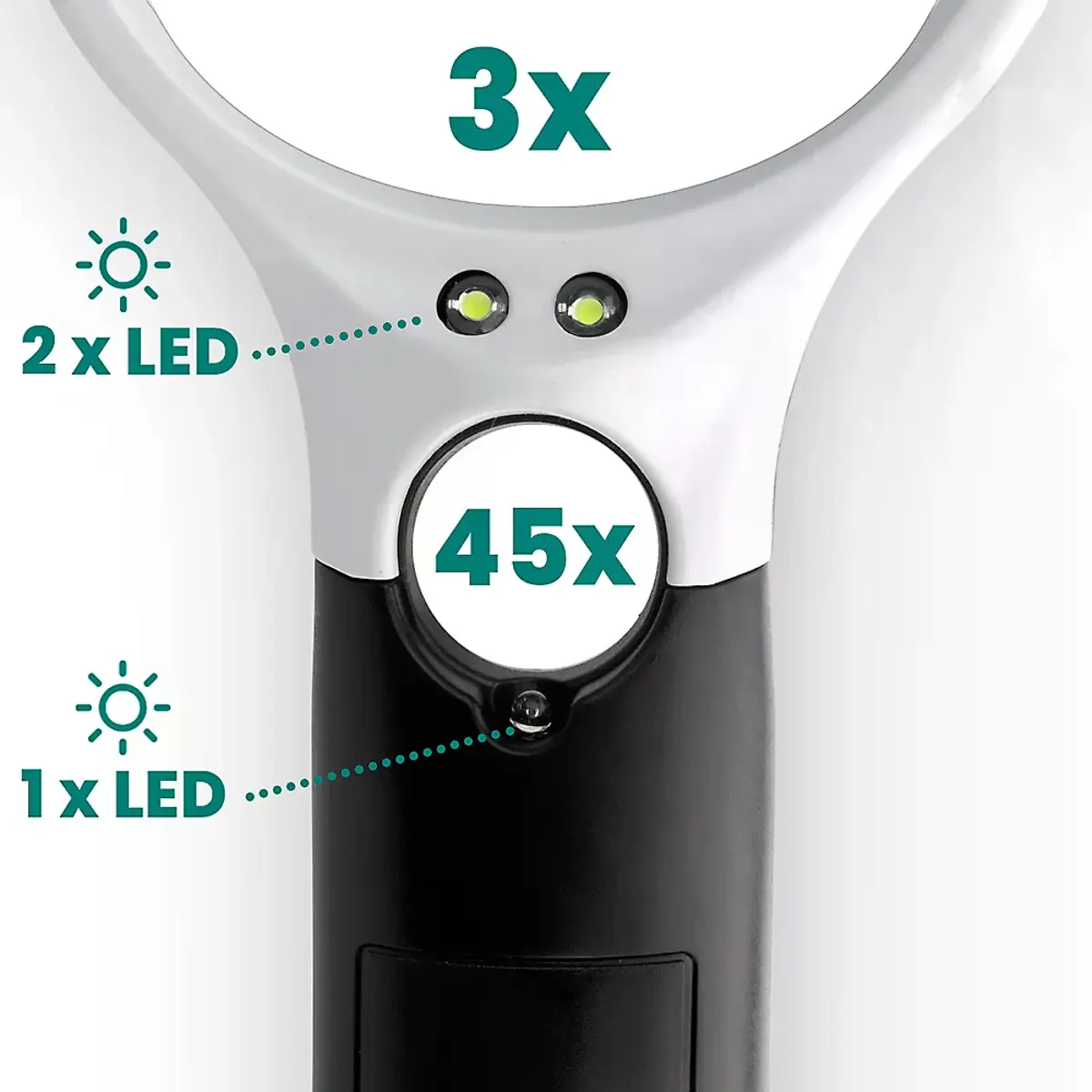 - Lente grande: aumento 3× com 2 LEDs