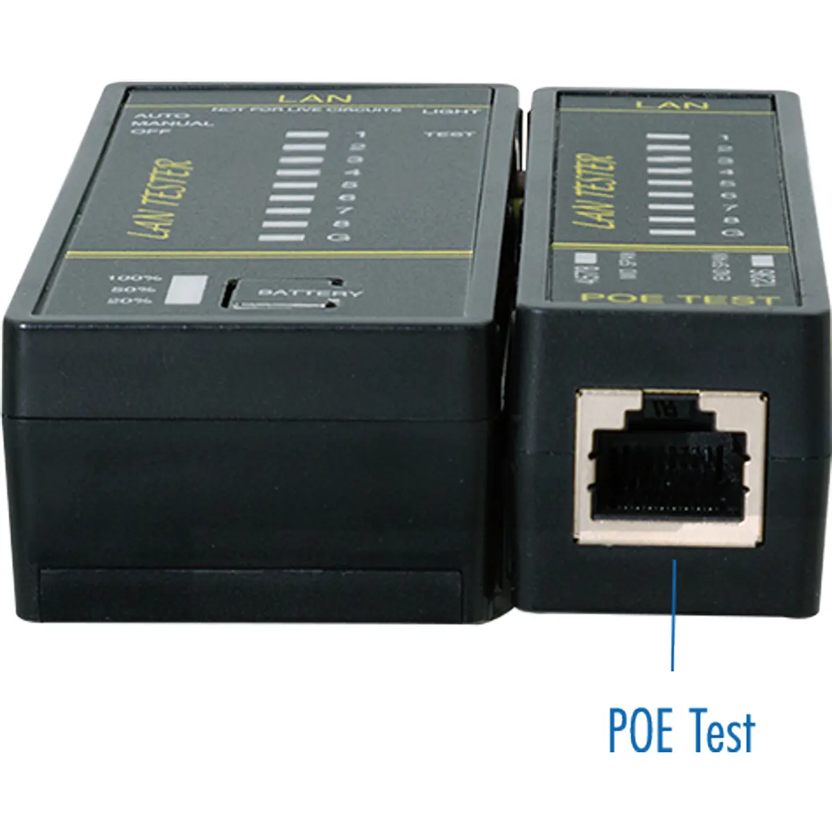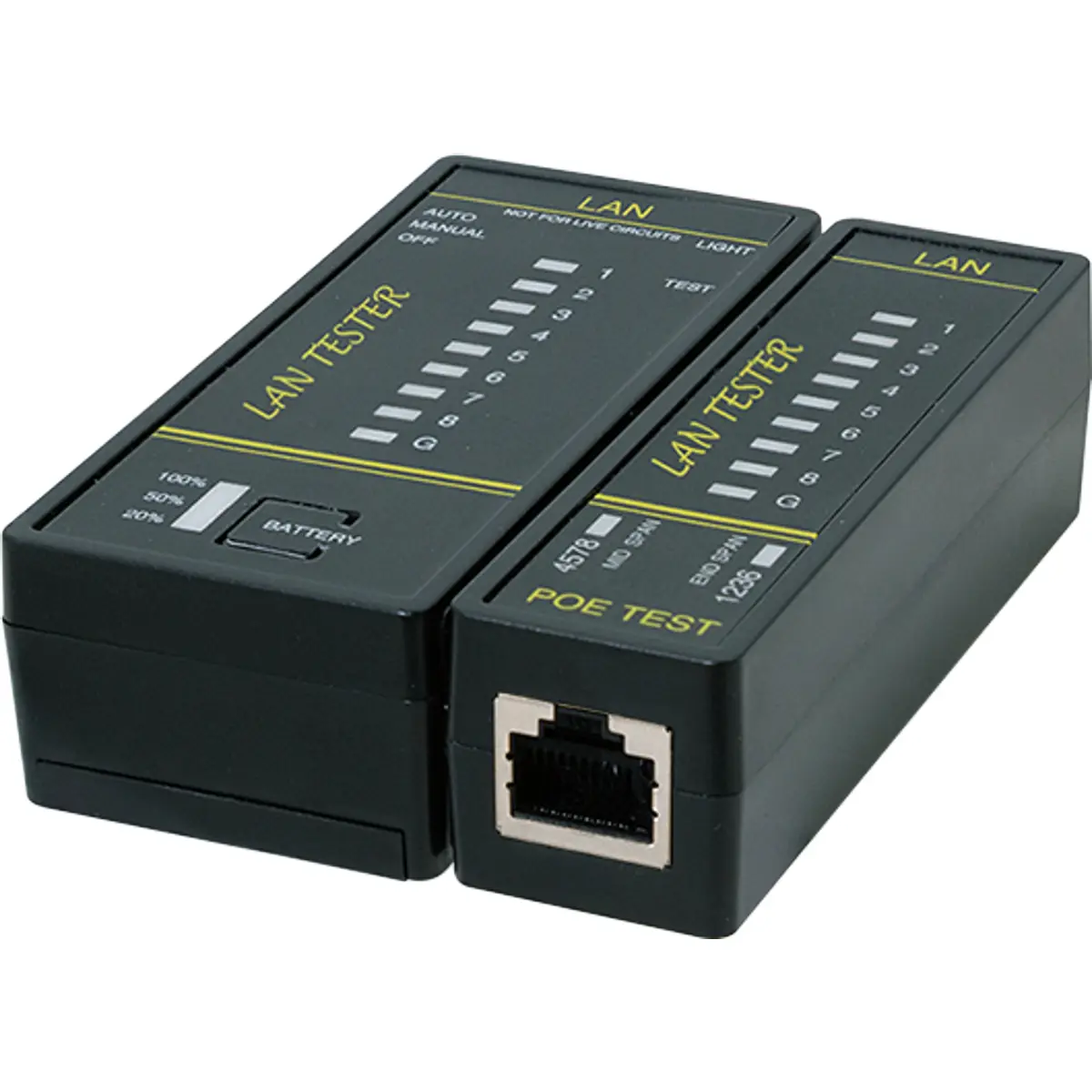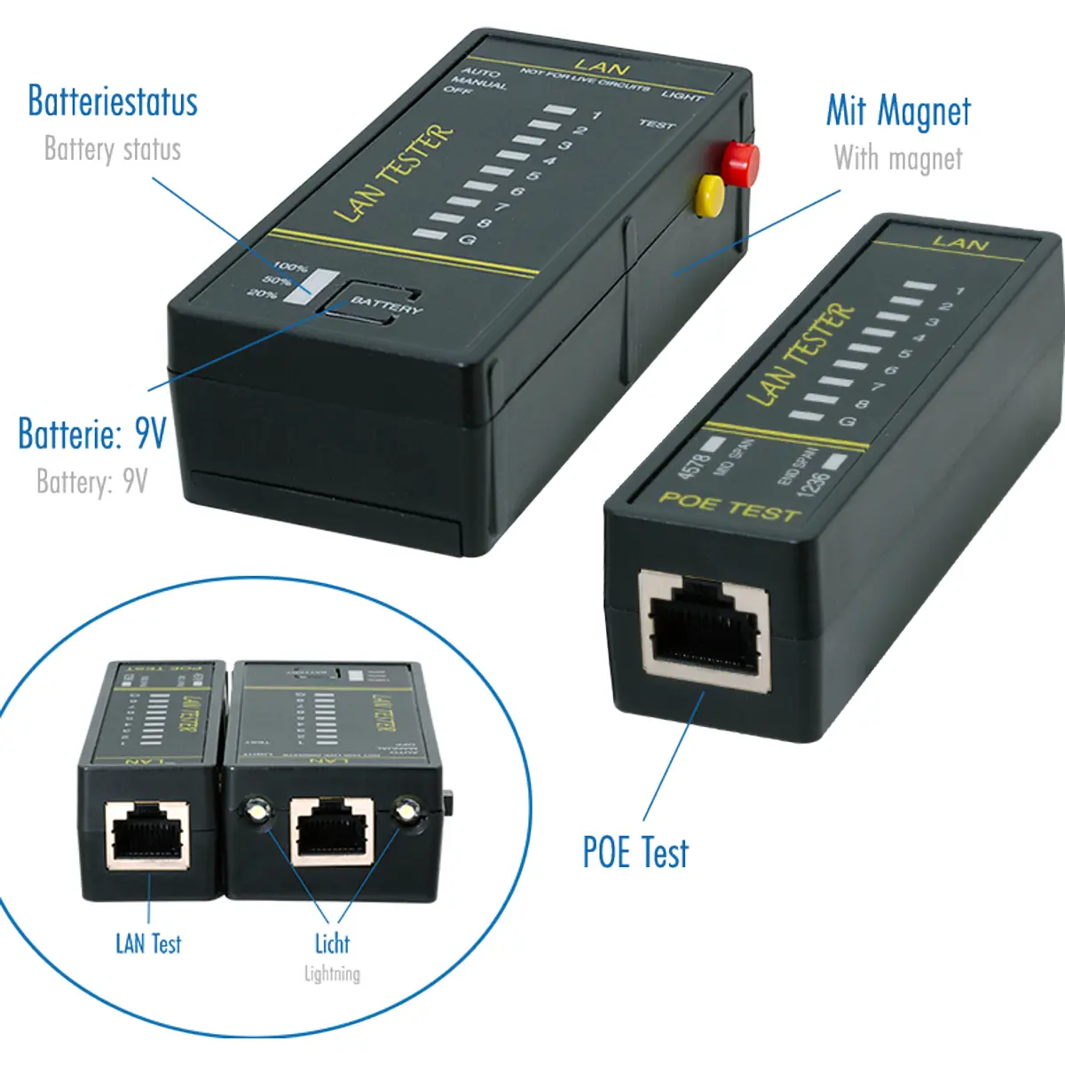 O mini testador LAN portátil permite verificar rapidamente cabos de rede e telefone, identificando falhas como circuitos abertos, curtos, cruzamentos ou pares invertidos. A unidade remota permite testar cabos já instalados, e o detetor PoE indica a presença e quais pares fornecem energia. Equipado com luz LED integrada e suporte magnético para maior comodidade.