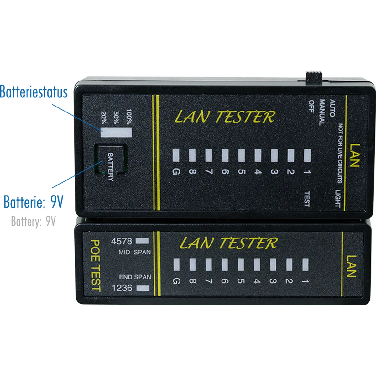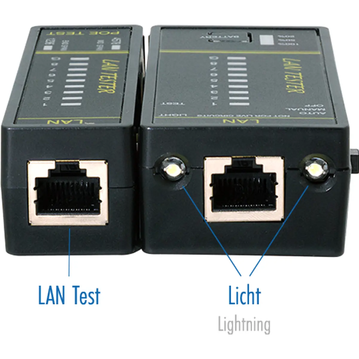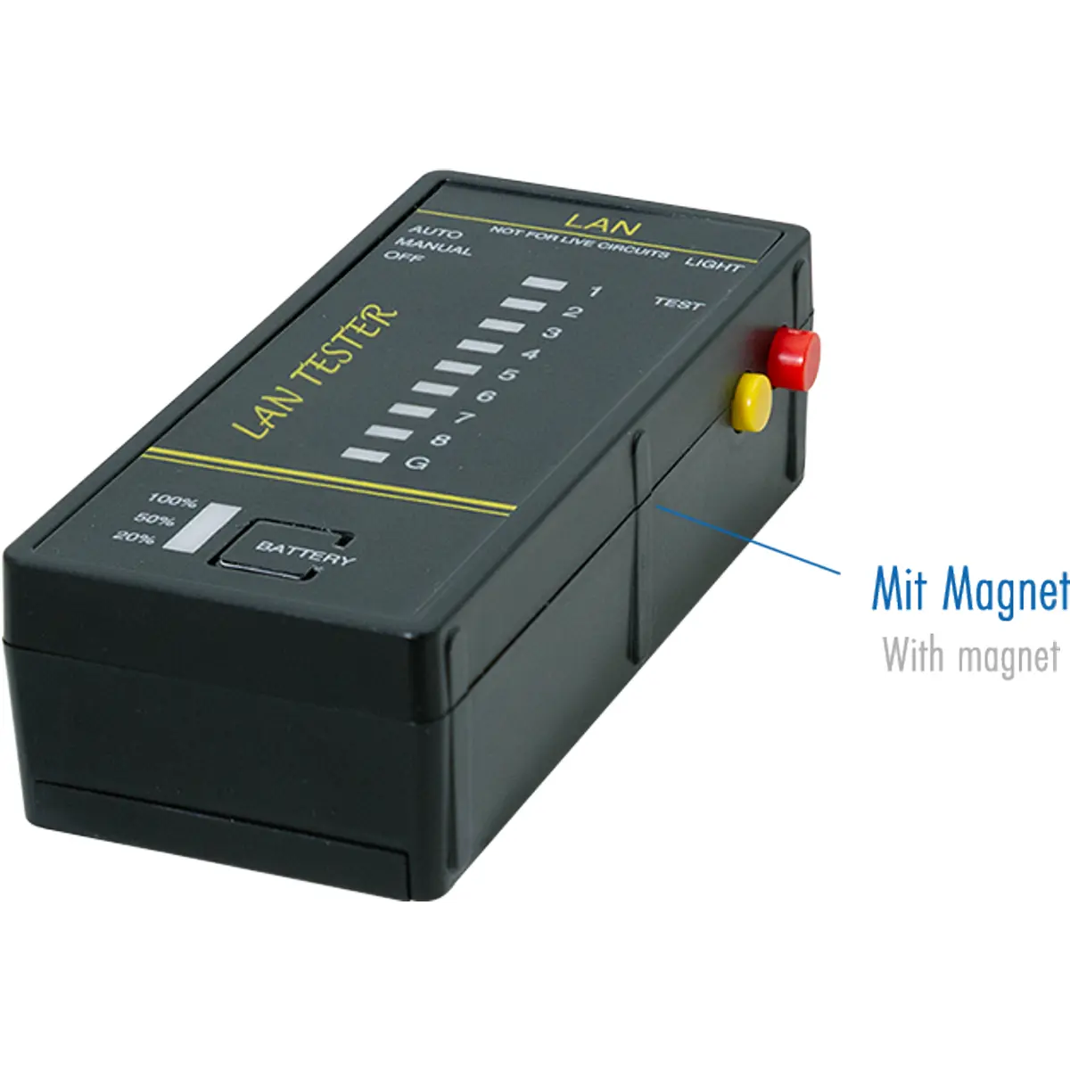 O mini testador LAN portátil permite verificar rapidamente cabos de rede e telefone, identificando falhas como circuitos abertos, curtos, cruzamentos ou pares invertidos. A unidade remota permite testar cabos já instalados, e o detetor PoE indica a presença e quais pares fornecem energia. Equipado com luz LED integrada e suporte magnético para maior comodidade.