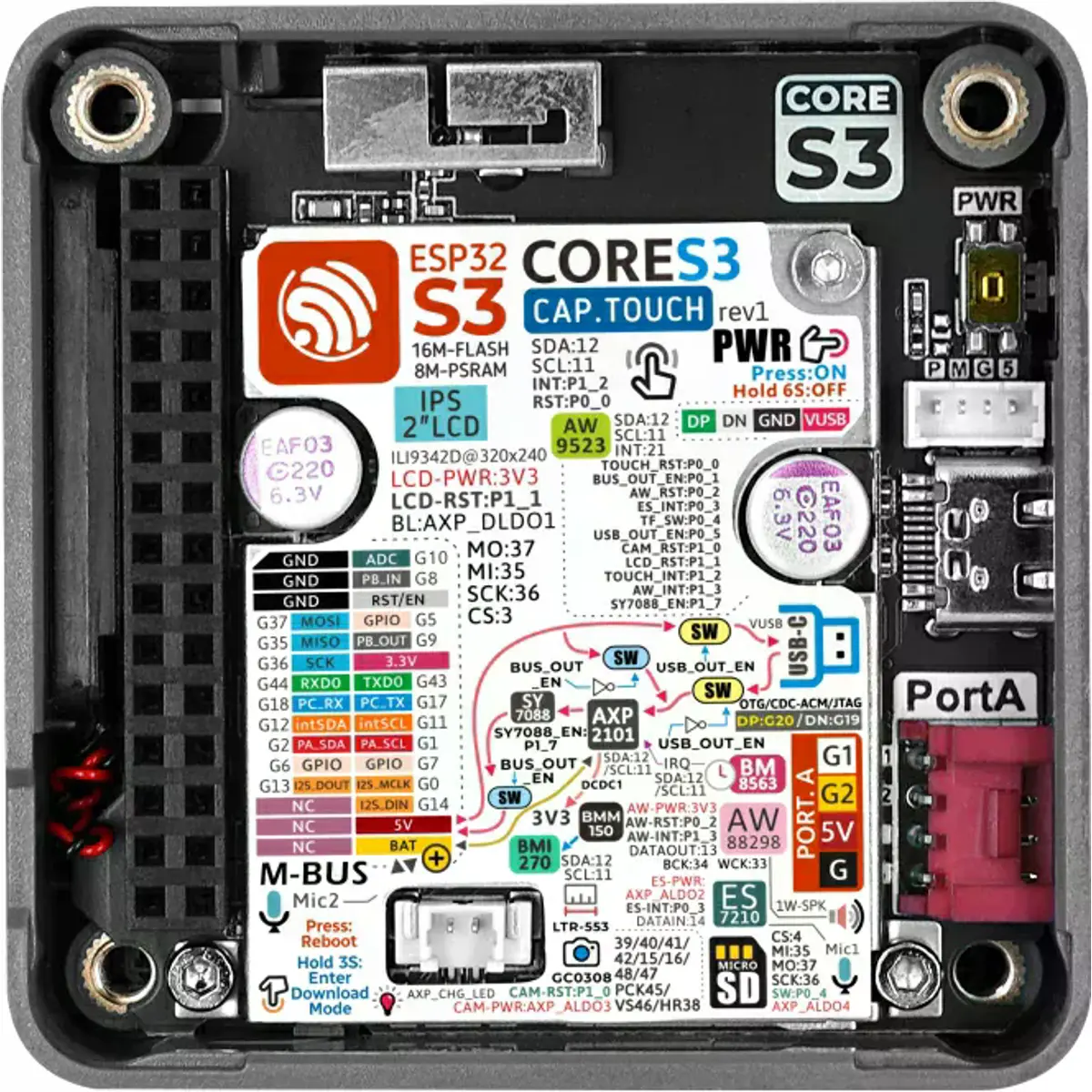 ◆ Gestão avançada de energia com PMU AXP2101 e RTC BM8563