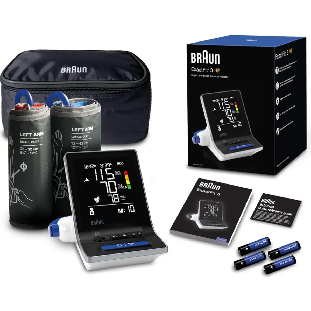 O Braun ExactFit 3 BUA6150WE é um tensiómetro automático de braço concebido para uso doméstico, que permite medir a pressão arterial (sistólica e diastólica) e a frequência do pulso de forma cómoda, com precisão clinicamente validada. Está desenhado para facilitar medições regulares e fiáveis, com memória para registos anteriores e função de média dos valores. Oferece conforto através de inflagem suave e inclui duas braçadeiras para diferentes tamanhos de braço.