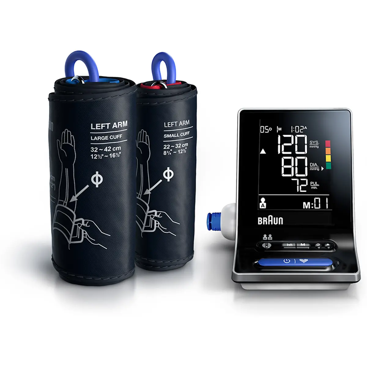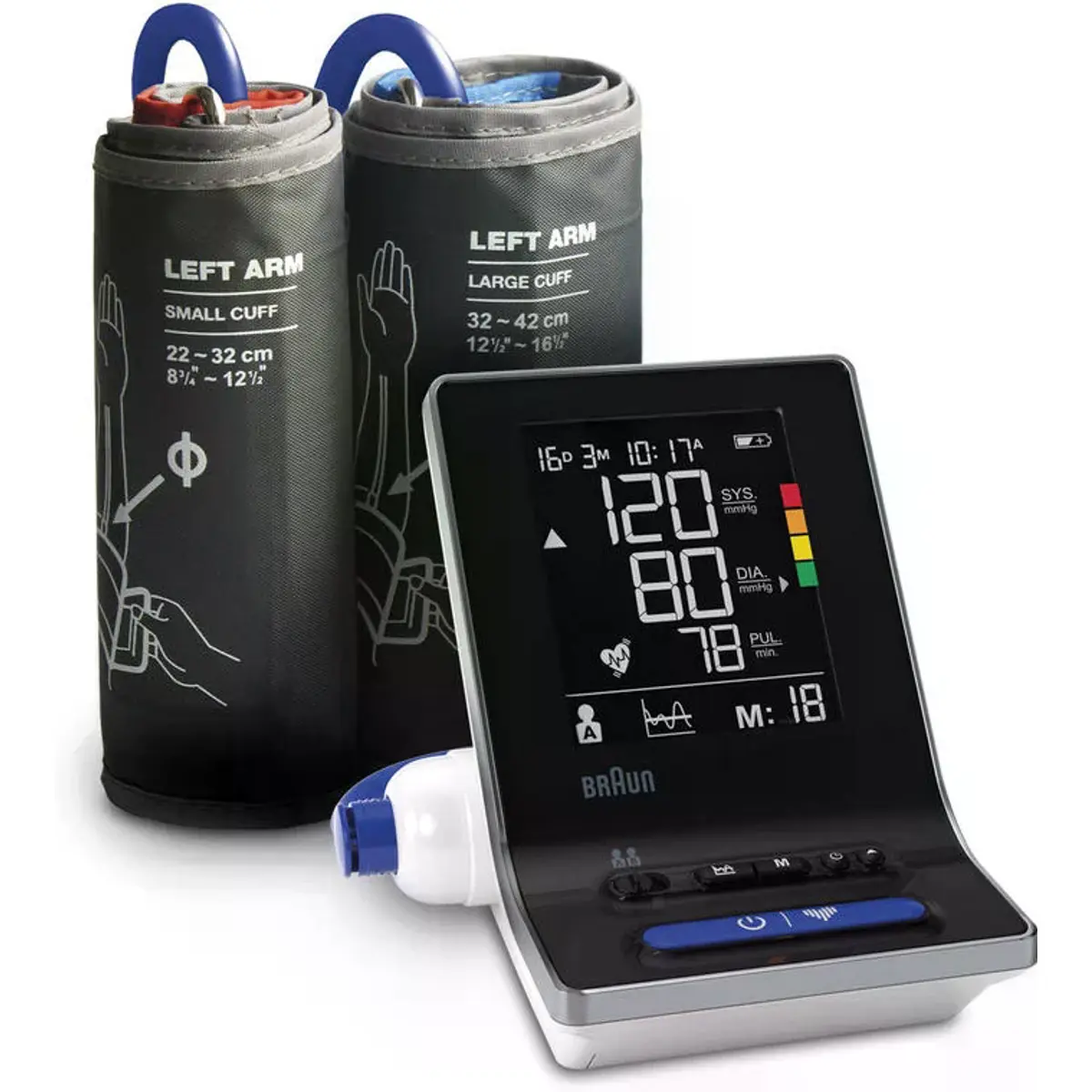 - Compatível com dois tamanhos de braçadeira: S/M e L/XL (circunferência 22–42 cm)