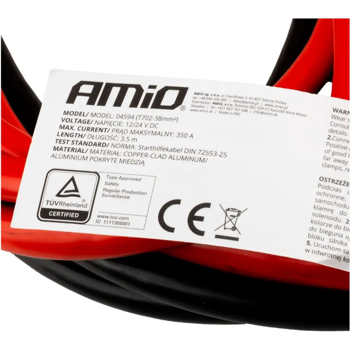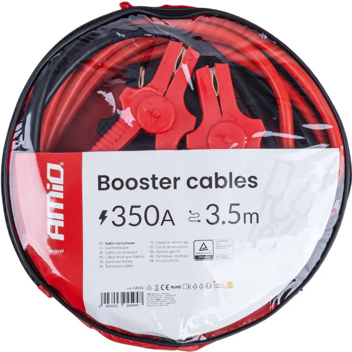 Cabos de arranque de alta qualidade com corrente máxima de 350A e comprimento de 3,5 metros, concebidos para arranques de emergência de veículos com baterias de 12V e 24V. Produto certificado TÜV, garantindo conformidade com os requisitos de segurança e durabilidade.