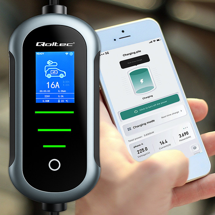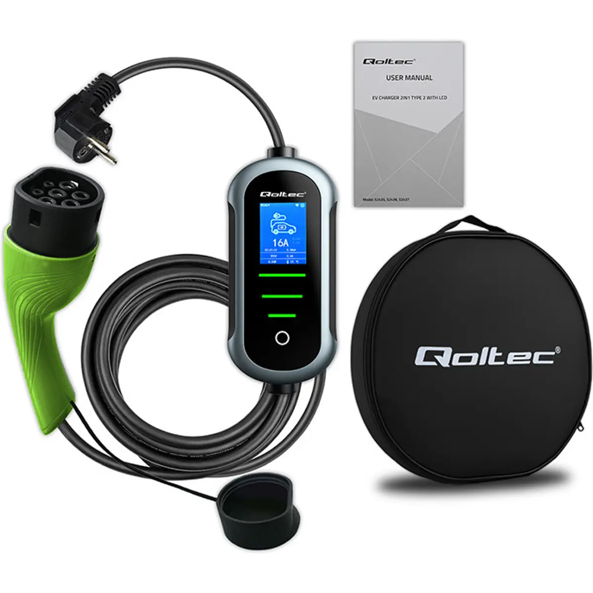 Qoltec - Carregador portátil para EV (compatível c/ Tuya) - monofásico 8-16A 3.5kW - Schuko - Tipo 2 - IP66 - 5m