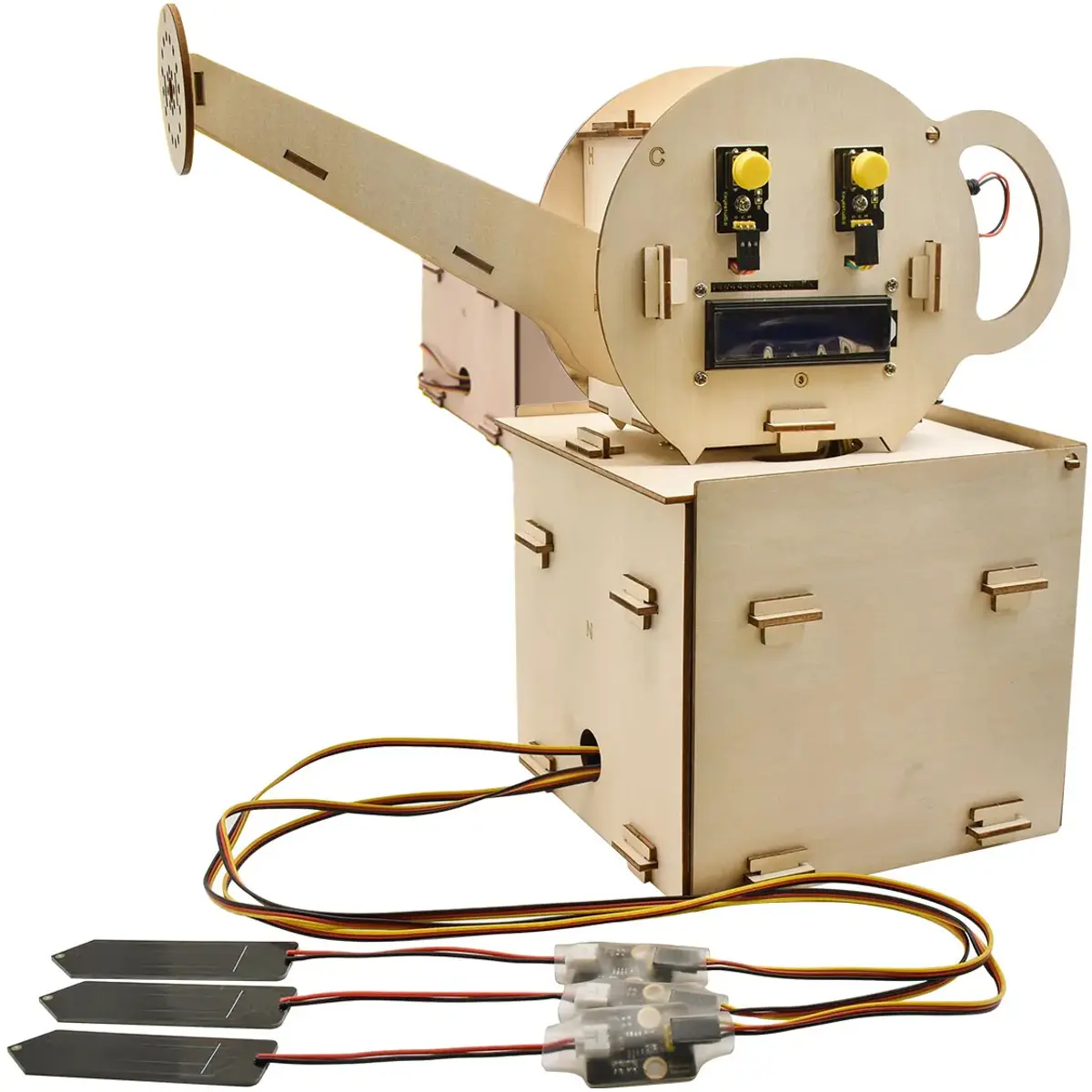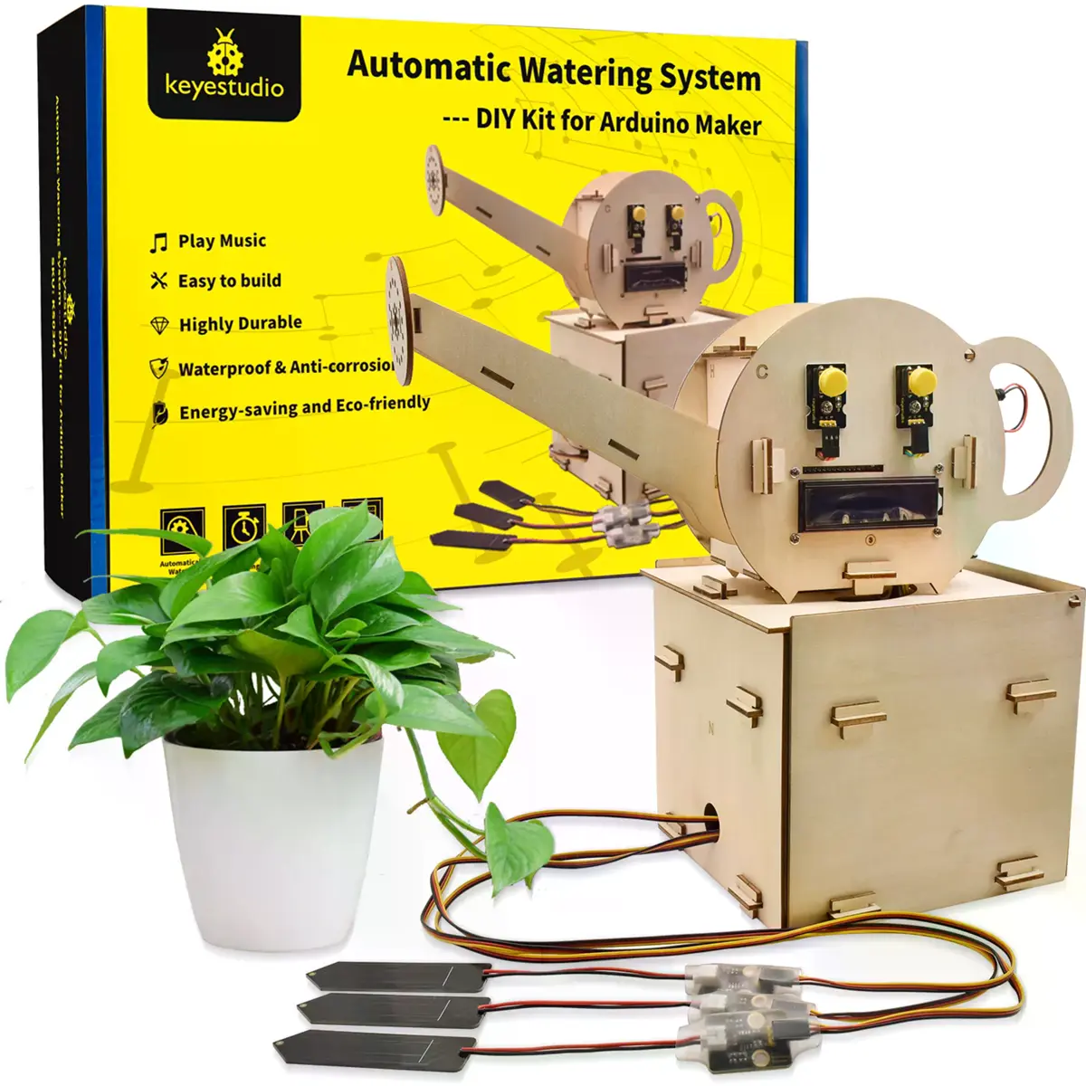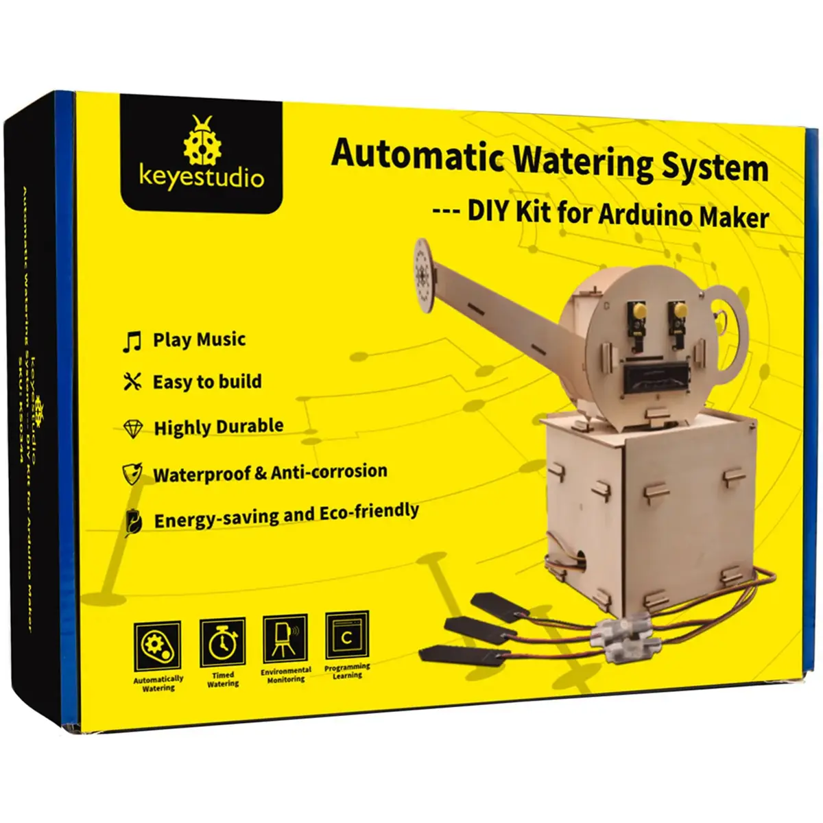 O Kit DIY de Sistema de Rega Automática Keyestudio KS0344 é um conjunto educativo baseado em Arduino, concebido para montar um dispositivo de rega que pode funcionar por temporização ou através de sensores. Com estrutura em placas de madeira e ligações por encaixe (sem soldadura), permite aprender eletrónica, controlo e programação em Arduino IDE (linguagem C), enquanto monitoriza condições do ambiente e do solo e rega automaticamente até três vasos.