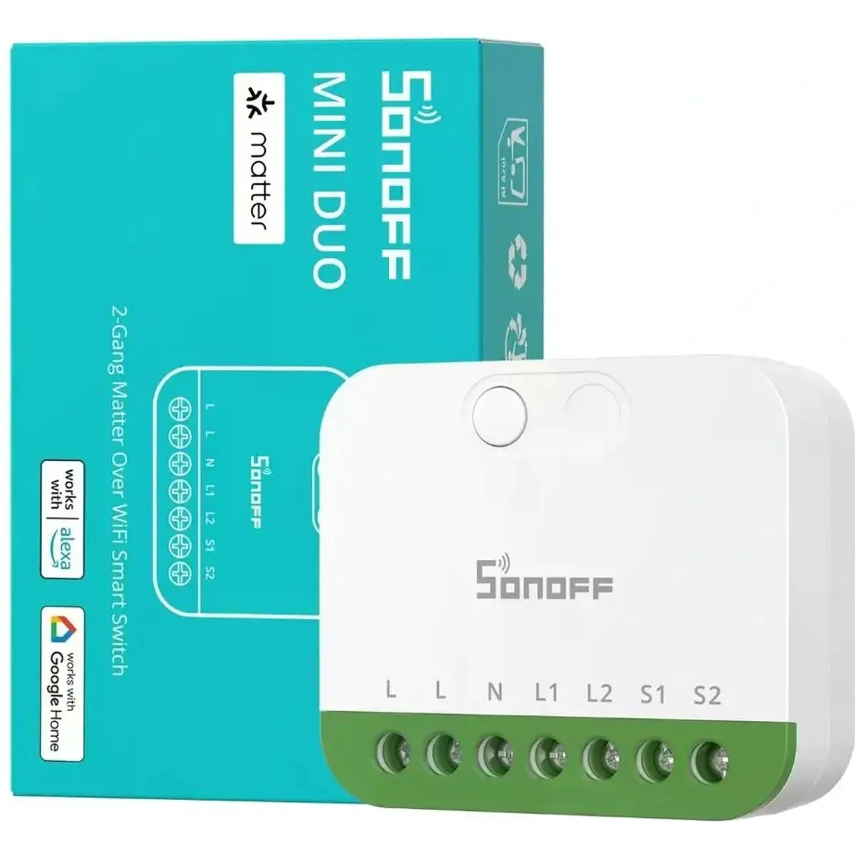 O Smart Switch SONOFF MINI-2GS é um interruptor inteligente compacto, de dois canais, que transforma dois circuitos tradicionais em dispositivos smart controláveis de forma independente. Compatível com o standard Matter, integra-se nas principais plataformas de casa inteligente como Apple Home, Google Home, Amazon Alexa e outras que suportem Matter, permitindo controlo por app, voz e automações personalizadas. O módulo instala-se discretamente atrás do interruptor de parede e suporta cargas em dois canais, com uma capacidade total de até 16 A. Desta forma, combina operação manual e inteligente para automatizar iluminação e pequenos aparelhos com confiança e segurança.