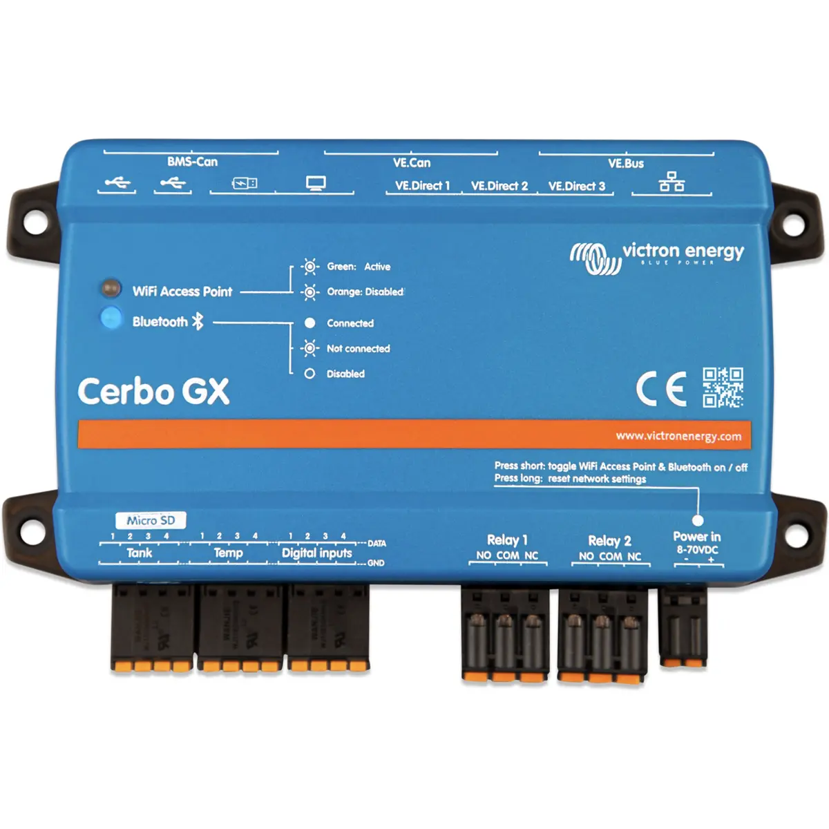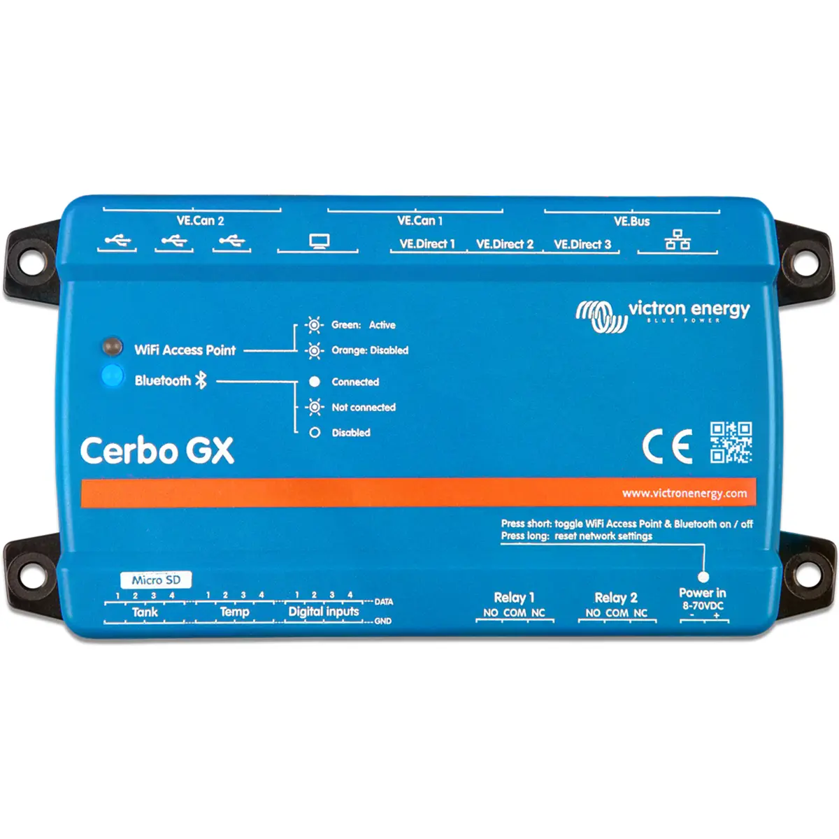 Com 4 entradas de depósito, 4 entradas de temperatura e 4 entradas digitais, o Cerbo GX MK2 adapta-se facilmente a aplicações que exigem mais informação do sistema, seja em embarcações, veículos, instalações autónomas ou sistemas híbridos.