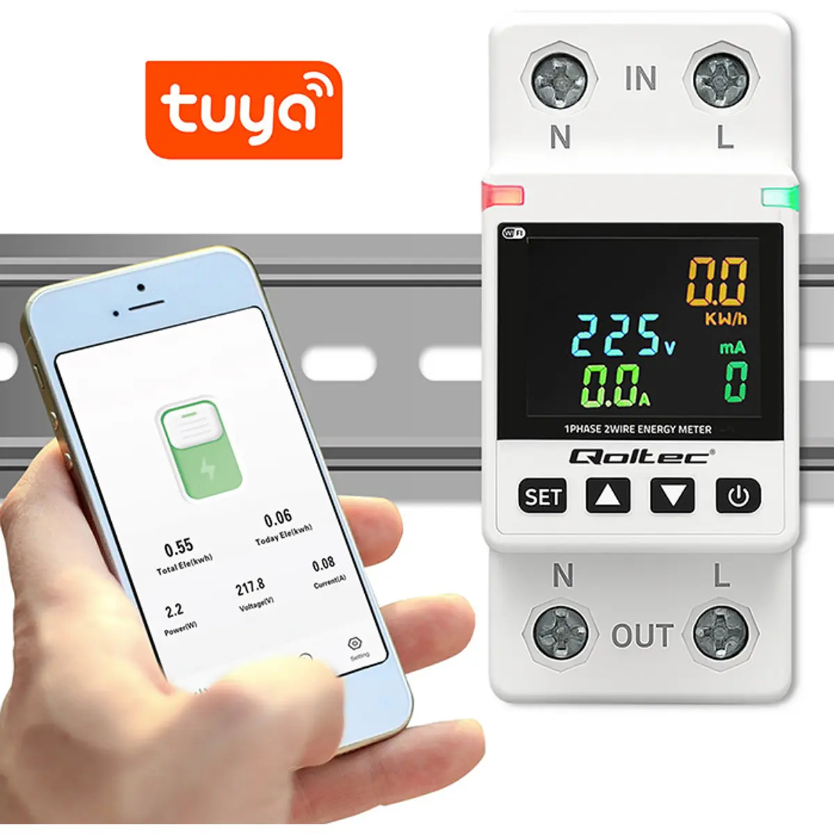 Equipado com um visor LCD de leitura clara, apresenta todos os parâmetros elétricos em tempo real. O controlo pode ser efetuado localmente através dos botões integrados ou remotamente através da aplicação Tuya / Smart Life, permitindo gerir consumos, criar horários e automatizações a partir de qualquer local com acesso à Internet.