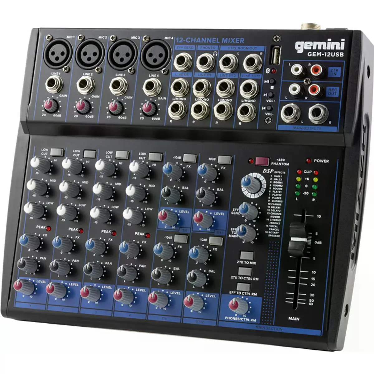 A GEM-12USB é uma mesa de mistura profissional concebida para fornecer áudio de elevada qualidade em aplicações como podcasting, atuações ao vivo e gravação em estúdio. Combina conectividade Bluetooth para reprodução sem fios com interface USB para ligação direta a computador, funcionando também como placa de som. O seu design compacto e portátil, aliado a circuitos analógicos de baixo ruído, garante um som limpo e preciso, adequado a DJs móveis, estúdios domésticos e pequenos espaços de atuação.