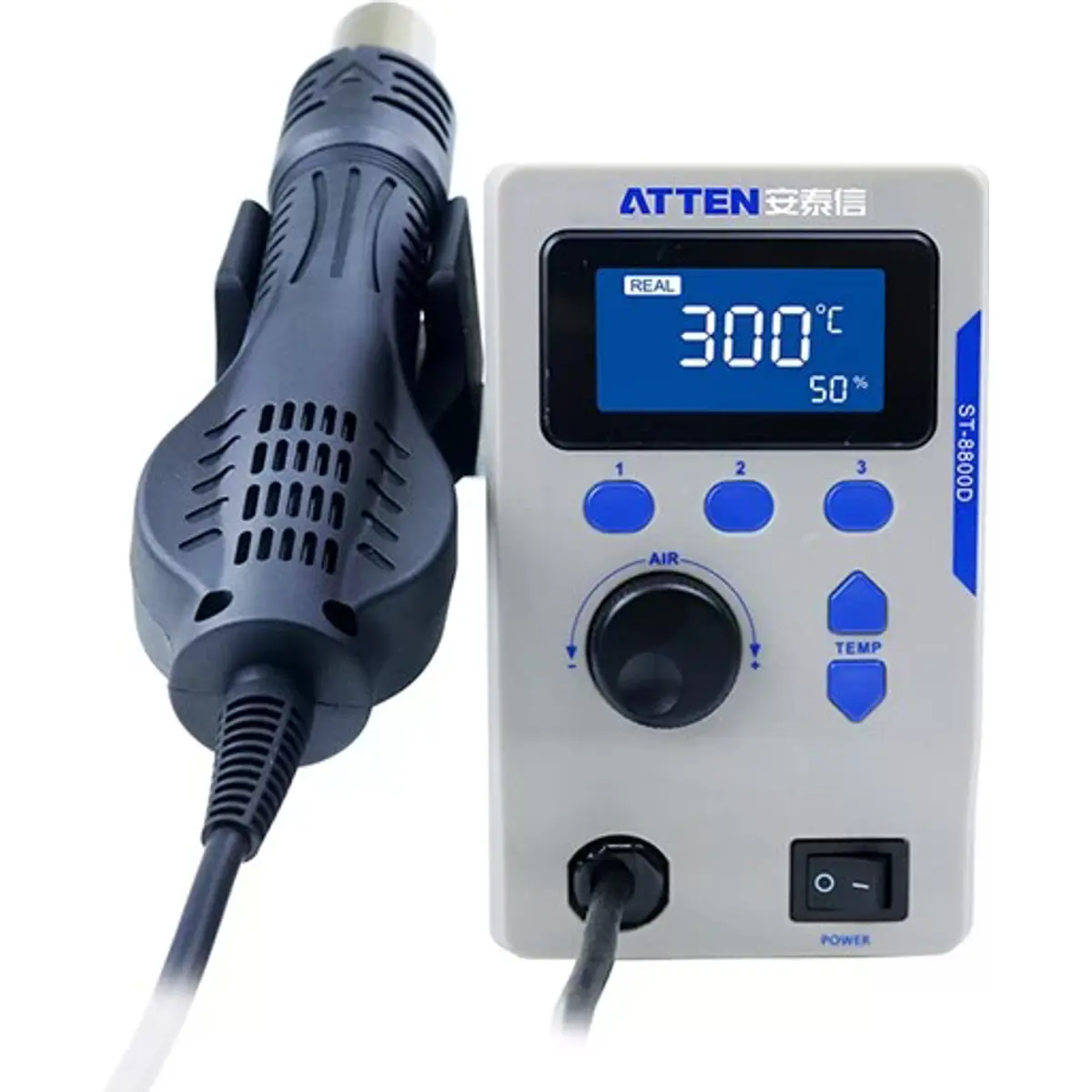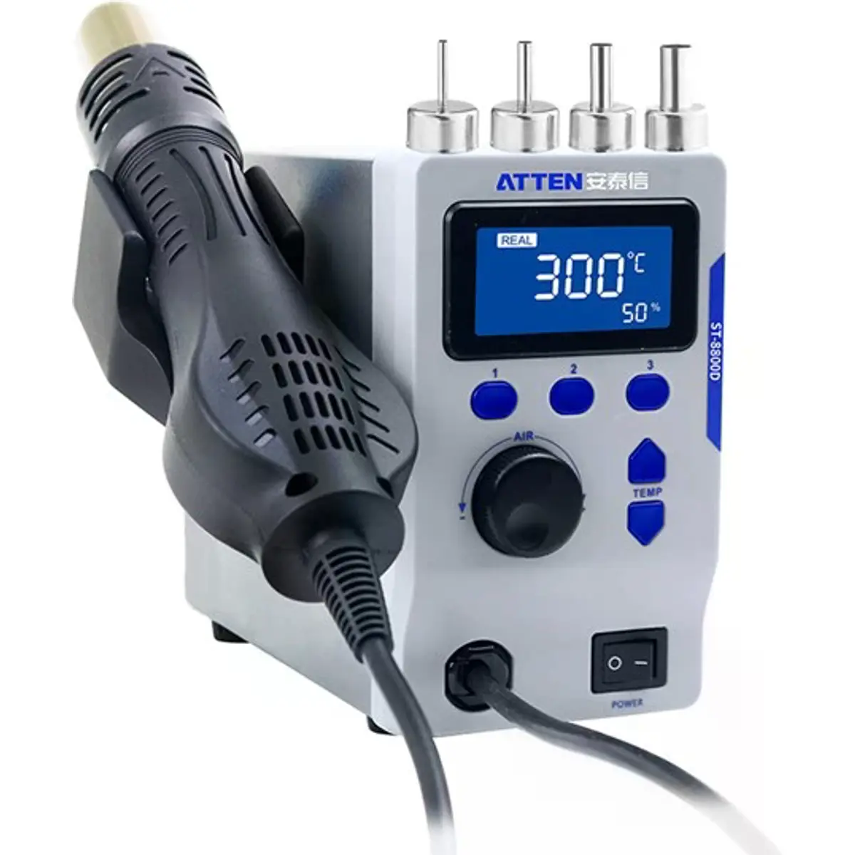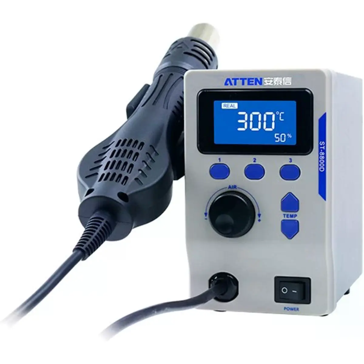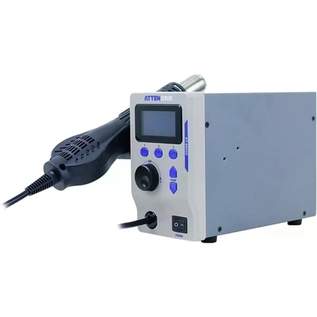 A ATTEN ST-8800D é uma estação de ar quente de bancada com display LCD, concebida para trabalhos profissionais de dessoldadura e aquecimento controlado. Com uma ampla gama de temperatura entre 100 °C e 500 °C, é ideal para dessoldar circuitos SMD sensíveis como QFP, PLCC, SOJ, BGA e CHIP. Adicionalmente, adapta-se a várias outras aplicações que exigem um fluxo de ar quente concentrado, como limpeza de impressoras 3D, montagem a quente ou aquecimento de materiais durante manutenção e montagem.