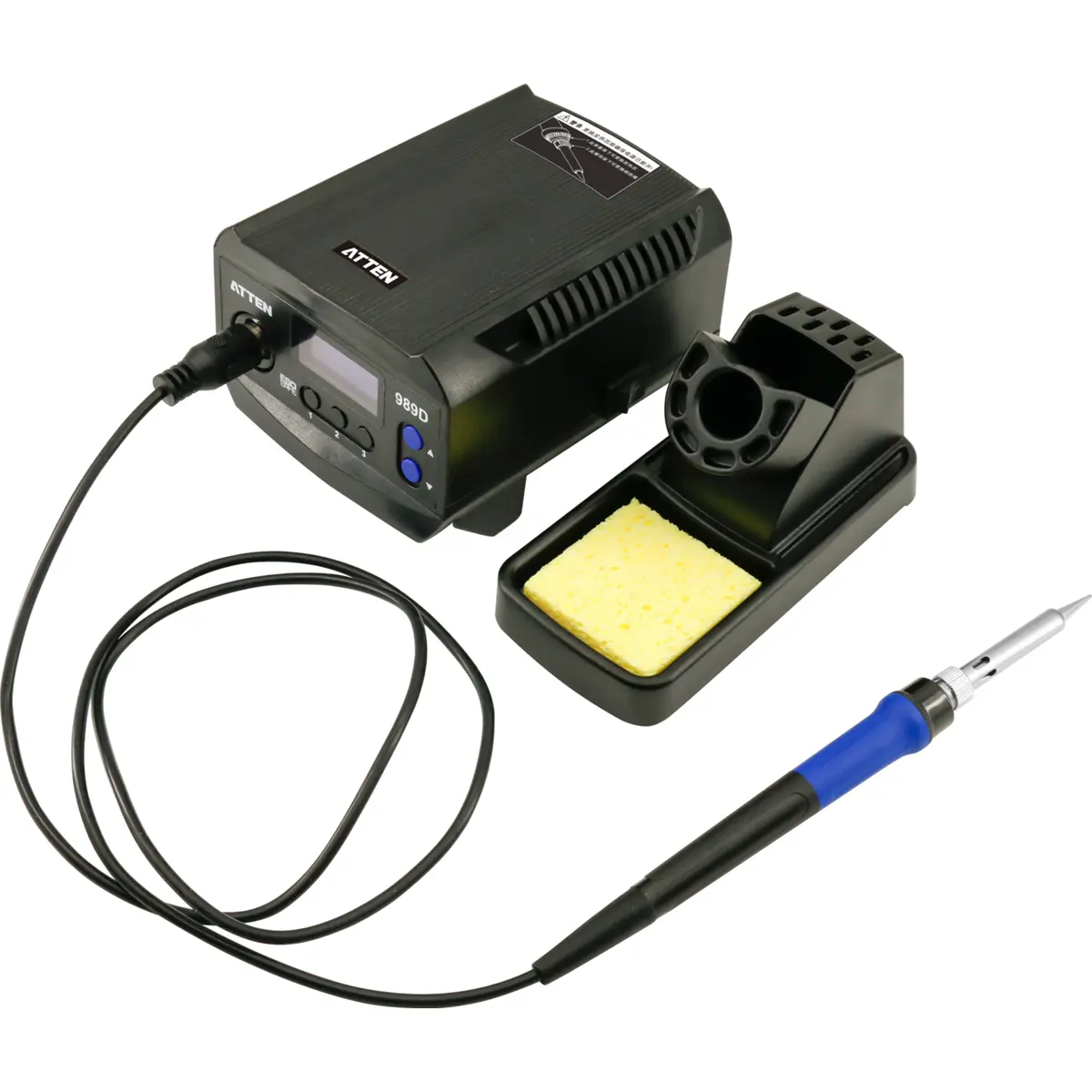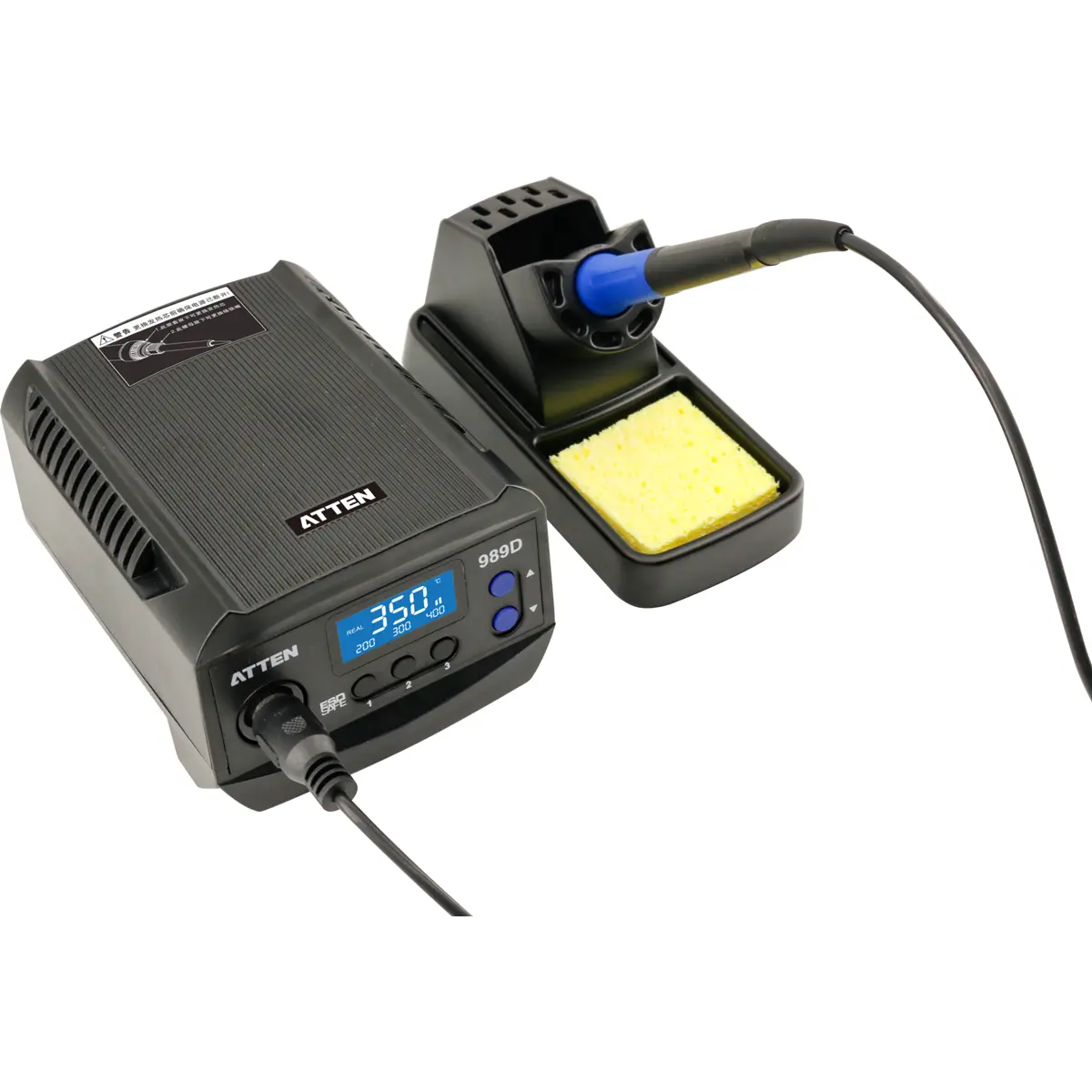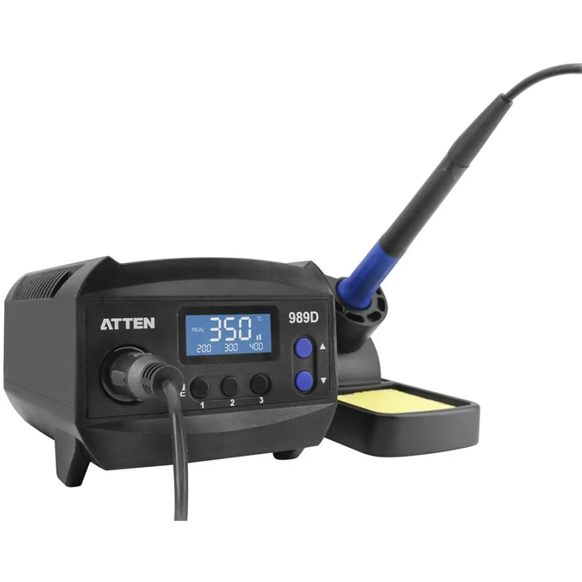 A ATTEN AT-989D é uma estação de soldar digital fiável e precisa, indicada para trabalhos de serviço, montagem, eletrónica de pequena escala e hobbies. Possui controlo digital de temperatura com display LCD claro, permitindo monitorizar facilmente a temperatura definida e a temperatura real. O elemento de aquecimento de rápida subida garante operação suave sem atrasos, utilizando baixa tensão AC para proteção antiestática, sem fugas de tensão e sem interferências.