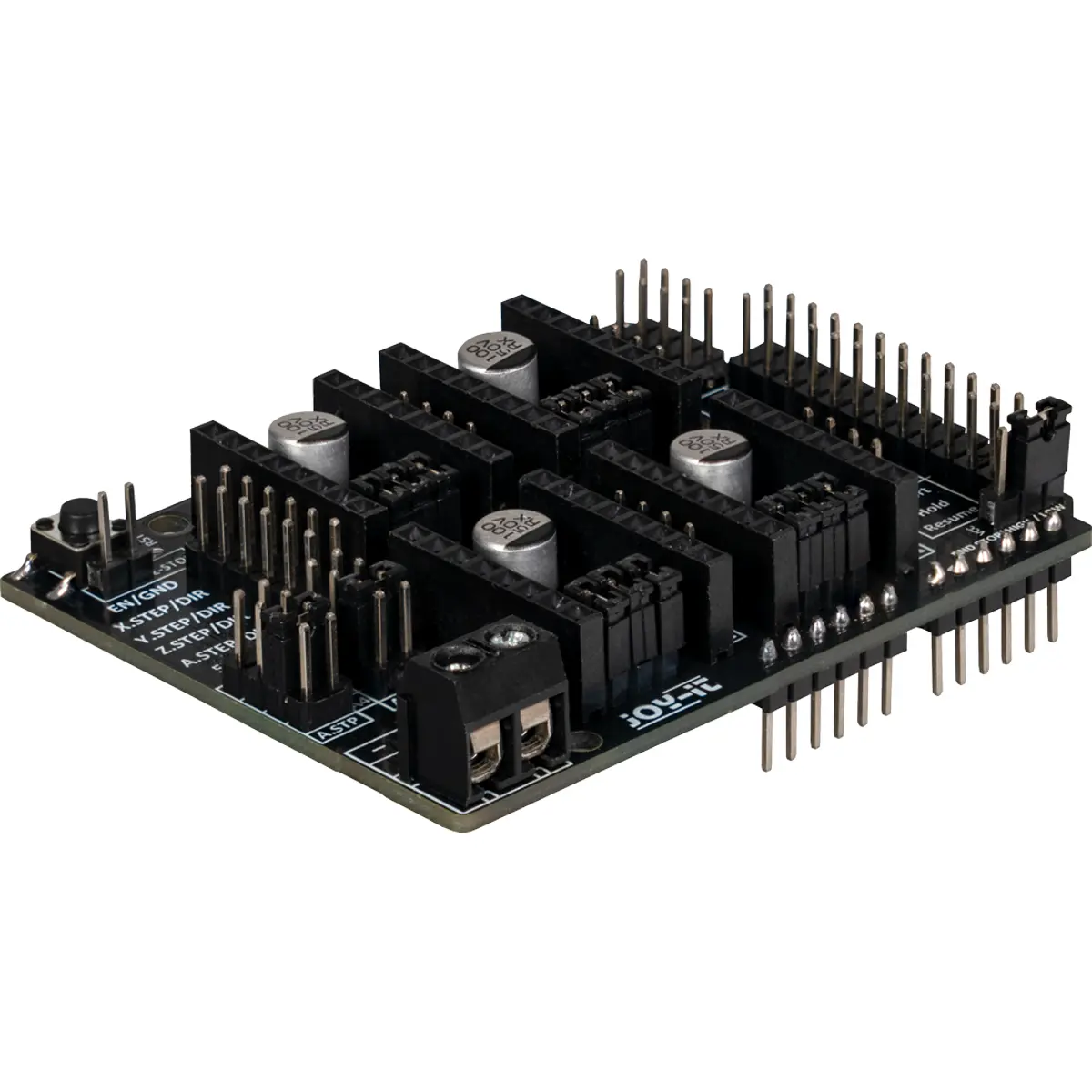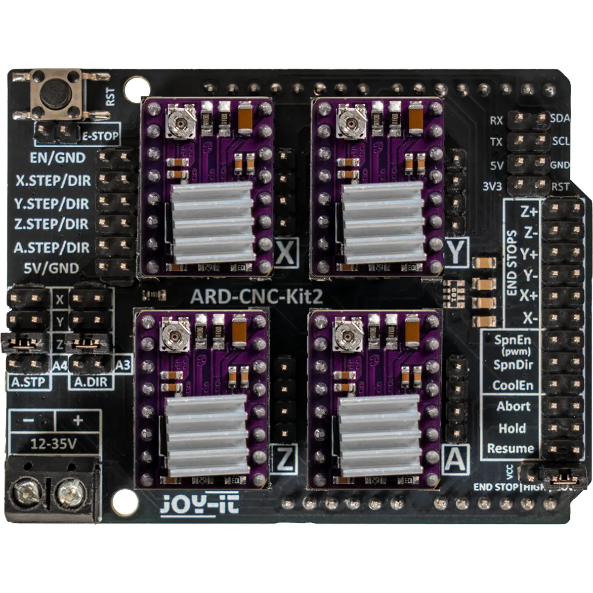 O ARD-CNC-Kit2 é uma shield CNC de 4 eixos desenvolvida para controlo preciso de máquinas CNC através de um Arduino Uno ou compatível. Compatível com GRBL v0.9, este kit permite implementar funcionalidades avançadas como controlo de spindle por PWM e limites de segurança por software, assegurando um funcionamento fiável e seguro em projetos de fresagem, gravação ou corte.