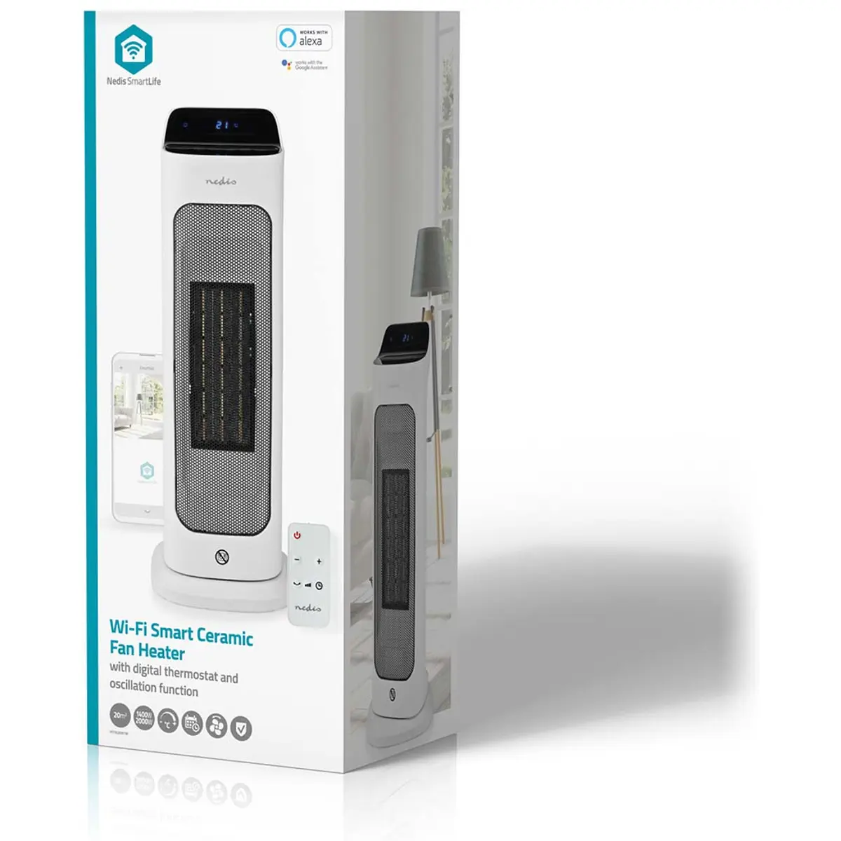 O aquecedor torre cerâmico Nedis Smart Wi-Fi permite aquecer rapidamente e de forma eficiente qualquer divisão até 20 m², podendo ser controlado remotamente através da app Nedis SmartLife, painel digital com ecrã LED, comando à distância ou por comando de voz via Alexa e Google Assistant. Ideal para a sala, escritório ou quartos, mantém a temperatura estável graças ao termóstato integrado e oferece calor uniforme com a função de oscilação. Seguro e conveniente, inclui proteção contra sobreaquecimento e queda, assim como pega integrada para fácil transporte.