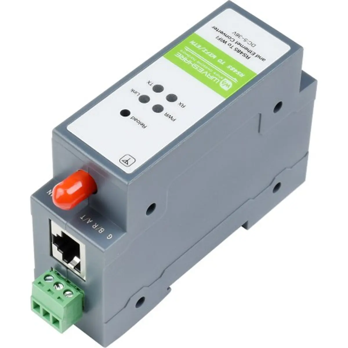 Suporta alimentação de 5–36 V DC, inclui proteções elétricas na interface RS485 e permite montagem em calha DIN, sendo adequado para instalação em quadros elétricos e armários técnicos industriais.