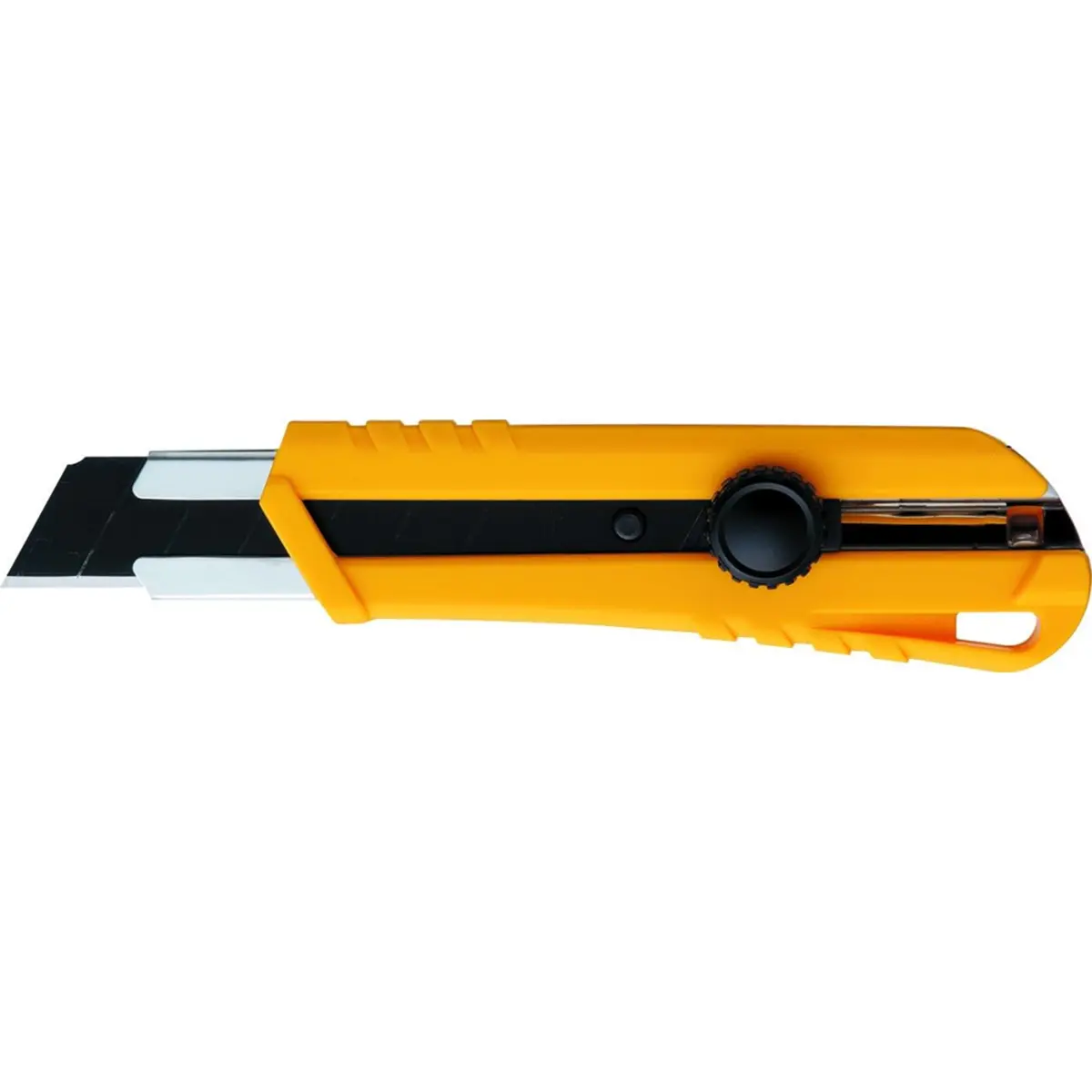 Faca profissional robusta com corpo em plástico ABS resistente, ideal para cortes exigentes. Vem equipada com uma lâmina preta de alta resistência, retráctil, de 25mm e 0,7mm de espessura. Concebida para trabalhos pesados, oferece durabilidade e desempenho fiável. Para reposição, utilizar lâminas de substituição HB-10B EVO.