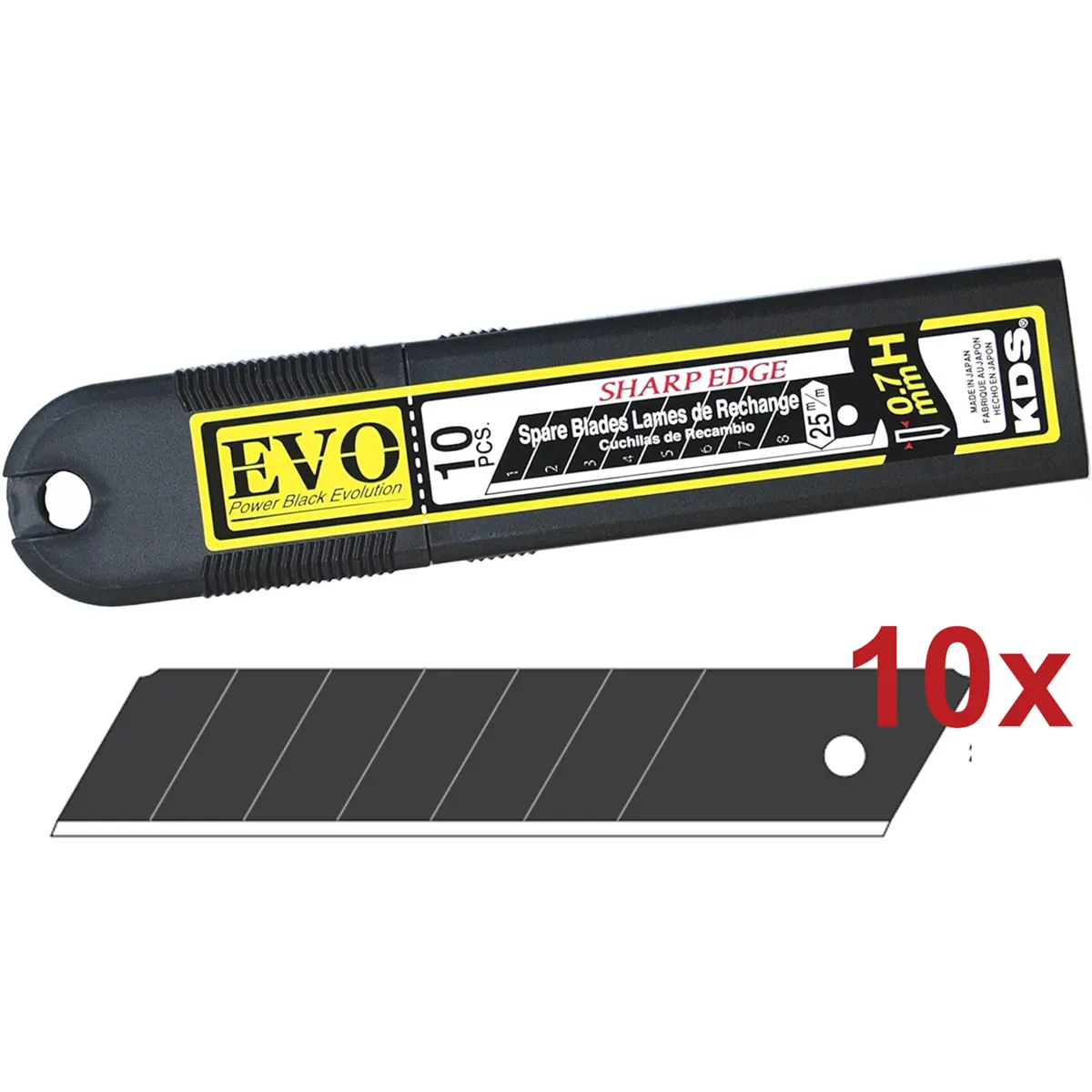 Caixa com 10 lâminas de substituição H-Type para facas retráteis KDS JobBossPro e outros compatíveis de 25 mm. As lâminas H-Type possuem 8 segmentos, são 40 % mais espessas que as lâminas Heavy Duty L-Type e recomendadas para cortes de materiais mais duros, como placas de gesso. Fabricadas em aço de alta tempera, mantêm a dureza e o fio afiado por mais tempo, garantindo durabilidade e performance fiável.