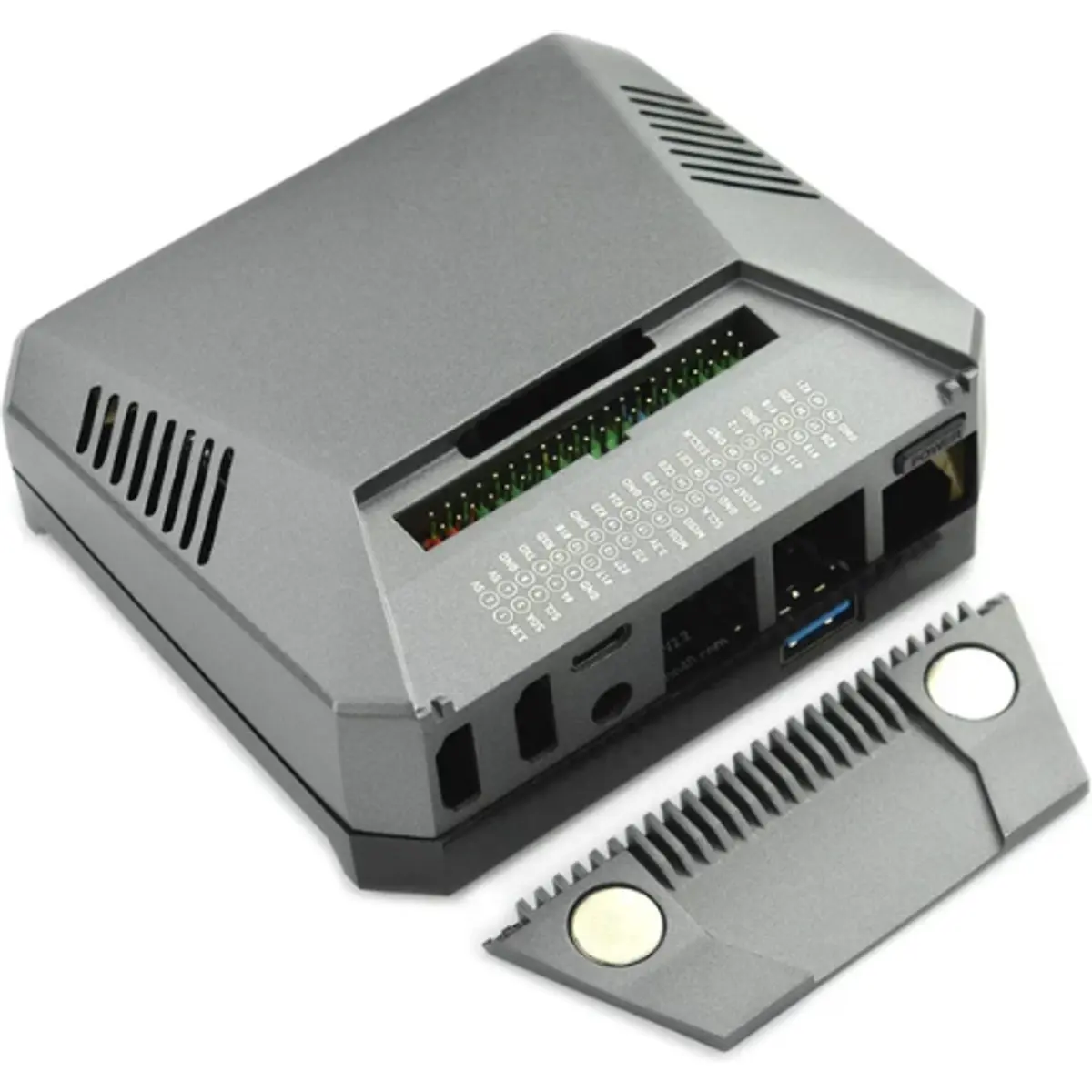 Caixa metálica de elevada qualidade para Raspberry Pi 4B, concebida para melhorar a dissipação térmica, otimizar a organização de cabos e permitir expansão de armazenamento interno. O design em liga de alumínio funciona como dissipador passivo, complementado por uma ventoinha integrada que assegura arrefecimento ativo sob cargas mais exigentes.