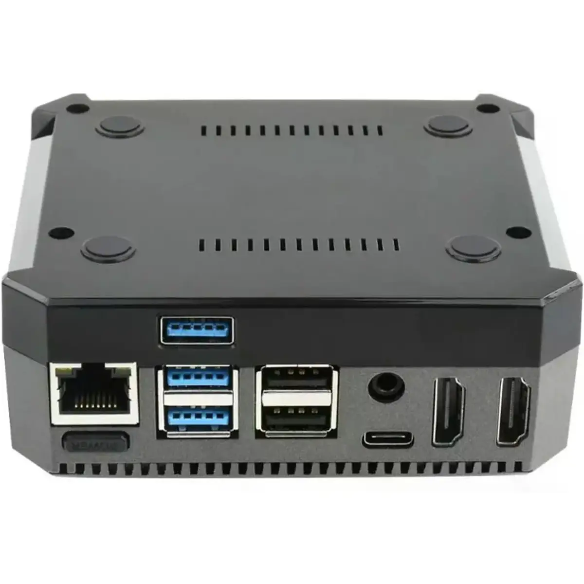 O chassis incorpora uma PCB interna que redireciona fisicamente as interfaces da Raspberry Pi 4 para um painel traseiro único, alinhando as portas USB, Ethernet, HDMI, áudio e alimentação na parte posterior da caixa. Esta disposição melhora a gestão de cabos e proporciona um acabamento mais organizado e profissional, semelhante ao de um mini-PC compacto.