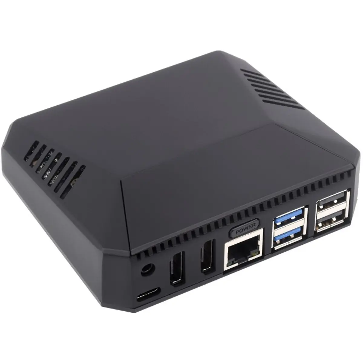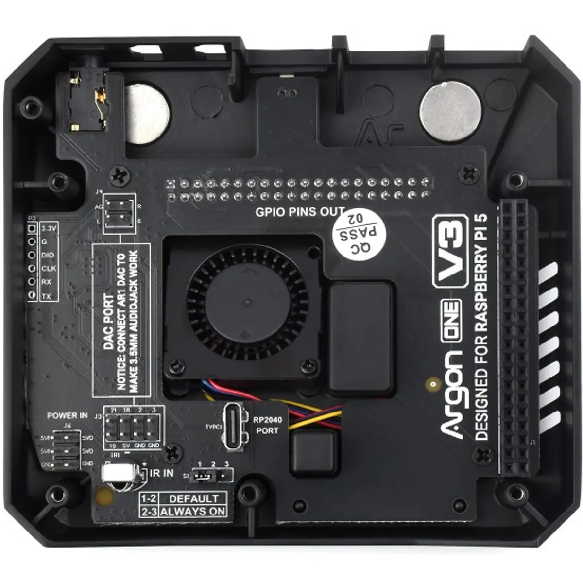 A estrutura superior em alumínio funciona como dissipador térmico passivo, enquanto a ventoinha blower de 30 mm com controlo PWM automático garante uma gestão térmica eficaz sob carga. O controlo do botão de energia e da ventoinha é assegurado por um microcontrolador RP2040 integrado, permitindo funcionalidades avançadas de gestão de energia.
