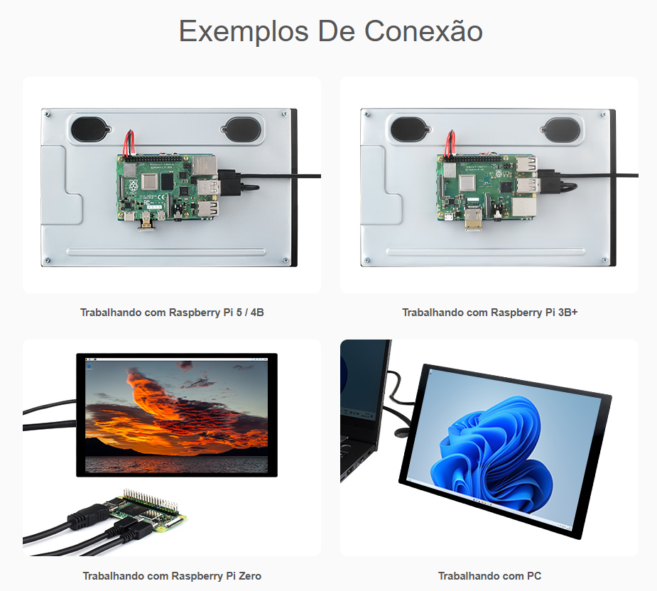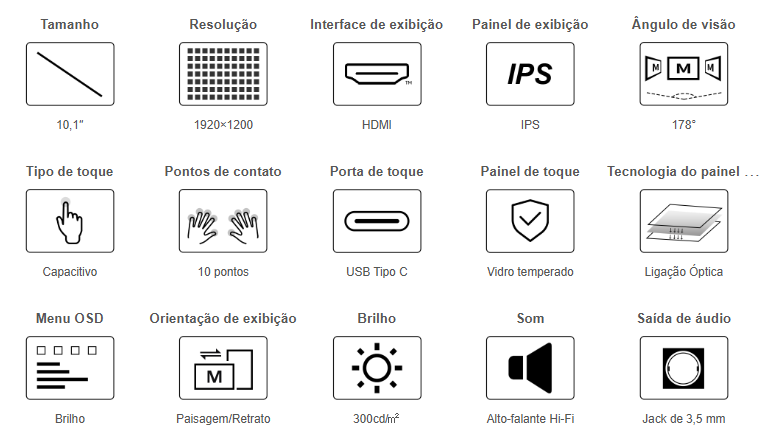 ✅ Toque capacitivo até 10 pontos (dependente do sistema operativo), com USB Type-C para a interface tátil.