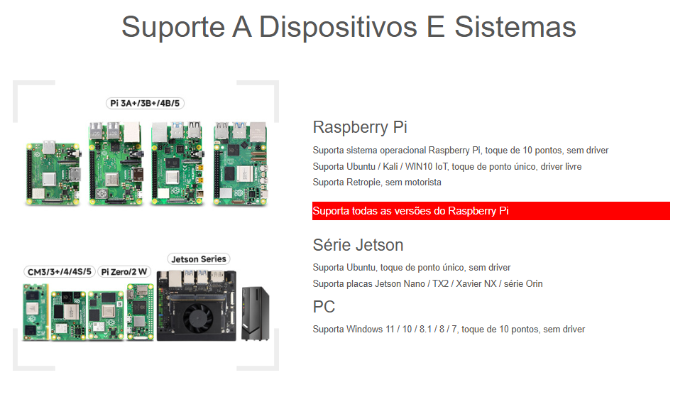 ✅ Compatibilidade driver-free em Windows (7/8/8.1/10/11) e amplo suporte em Raspberry Pi/Jetson (com limitações de pontos de toque consoante o SO).